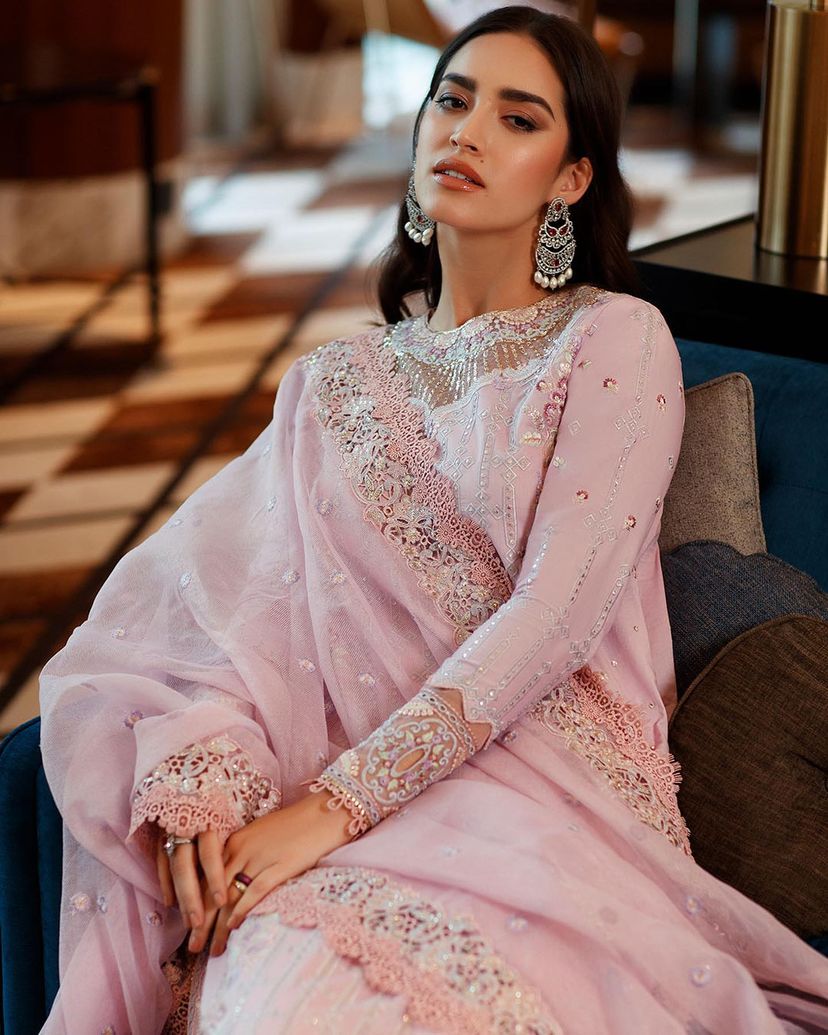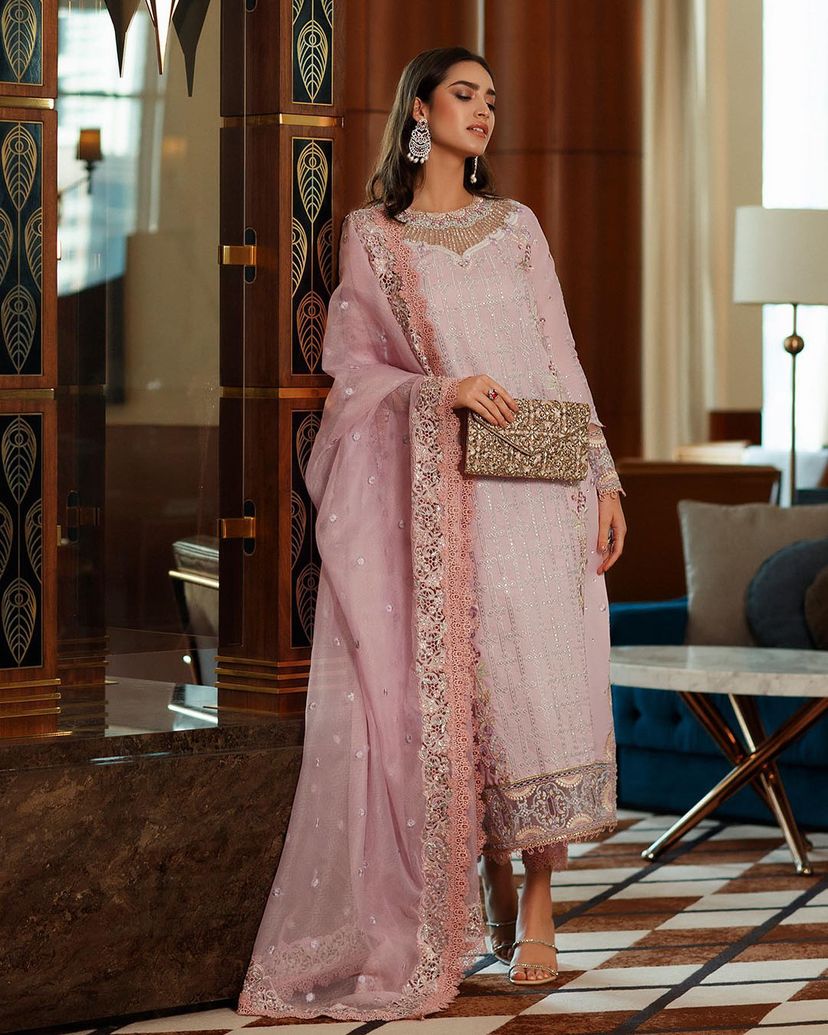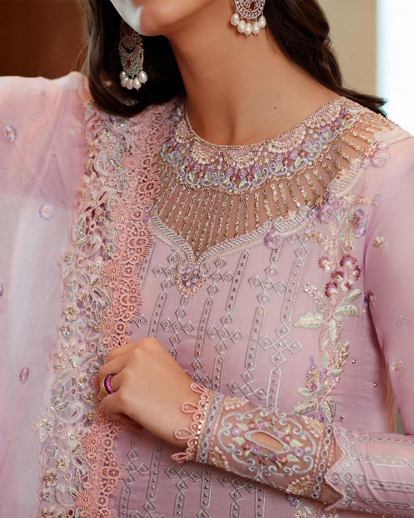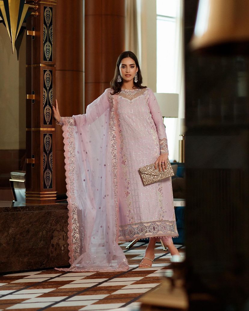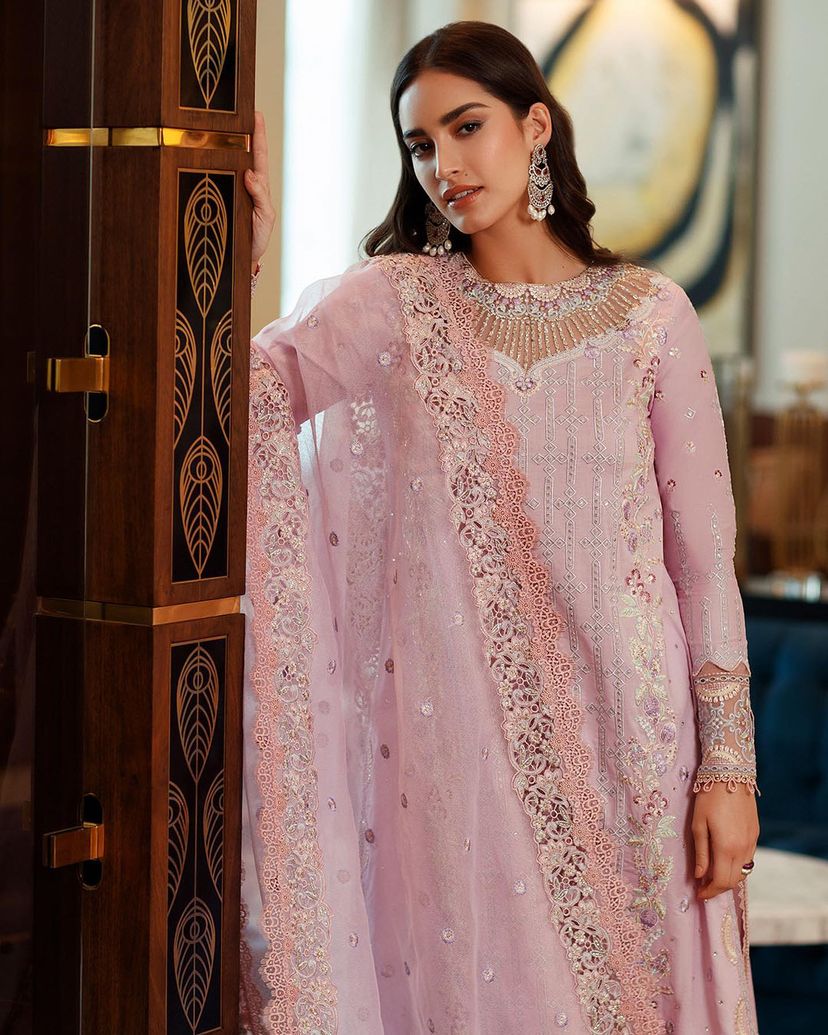 Capture the essence of ethereal beauty with our baby pink ensemble, where delicate silver embellishments interweave like tendrils of ivy. The embellished border of the dupatta adds a touch of whimsy to your ensemble.