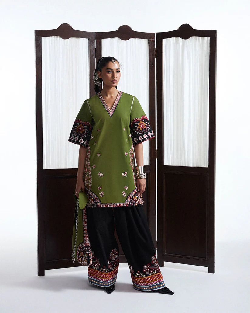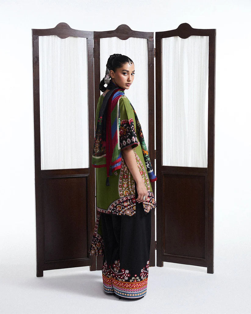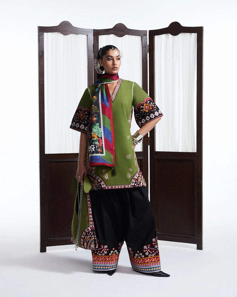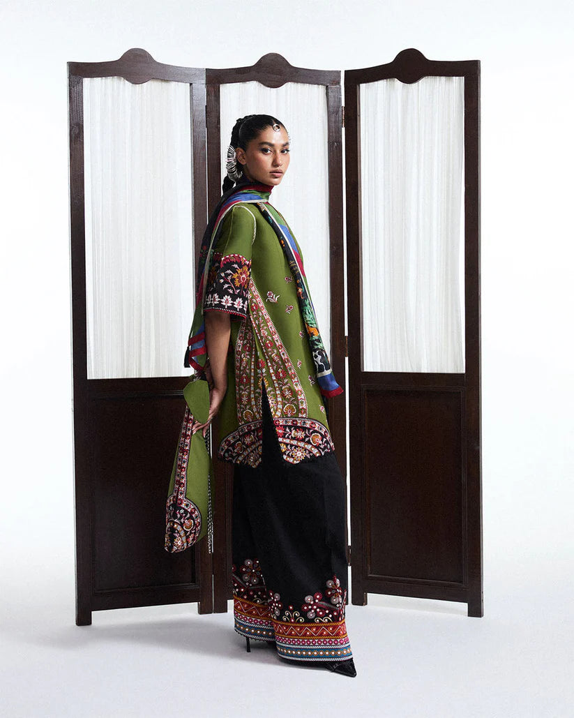 A refined celebration of heritage and artistry, this ensemble features an olive green short shirt intricately adorned with multicolored Kashmiri embroidery. The finely detailed motifs on the short sleeves and hem reflect traditional craftsmanship, rendered with elegance and precision. It is paired with a voluminous black shalwar, enriched with delicate panni embroidery and vibrant multicolored borders that lend depth and contrast to the look. A digitally printed silk scarf, draped gracefully, adds a contemporary touch with its rich palette and tasseled edges. The overall composition is poised yet striking—an ode to timeless tradition with a modern, graceful silhouette.