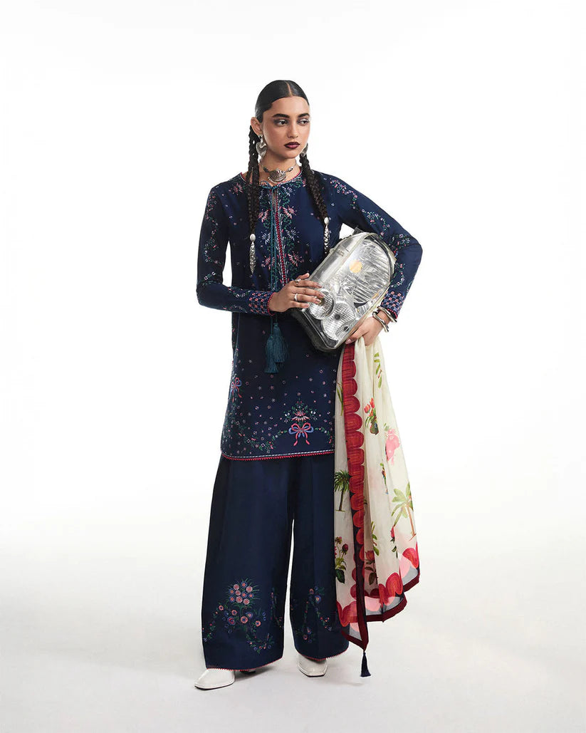 A bold celebration of color and craftsmanship, this navy blue ensemble is richly embroidered with multicolored floral motifs that bring a lively charm to its structured silhouette. The short shirt, accented with tassels, pairs effortlessly with the fitted embroidered sleeves and matching shalwar, creating a harmonious flow of intricate detail. A digitally printed silk scarf with tassels completes the look, adding a touch of softness and movement to this vibrant, statement-making outfit.