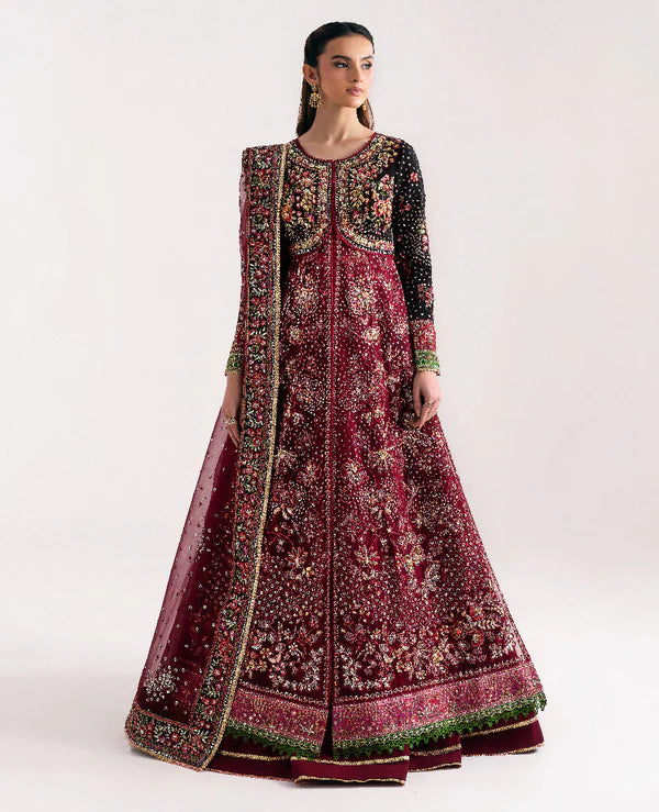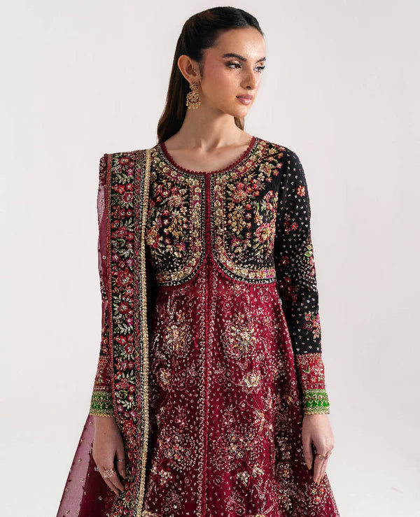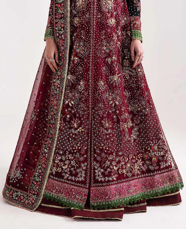 A front-open, four-paneled shirt featuring a black bodice and red panels decorated with silver motifs. The hem has lush green and hot pink borders, finished with green lace. The red organza dupatta is adorned with a sequin bust in the center, surrounded by a four-sided floral border and delicate lace on all sides. The black sleeves are embellished with floral embroidery and sequins, featuring two borders in green and hot pink, finished with lace. Paired with raw silk lehnga trimmed with golden lace at the cuffs.