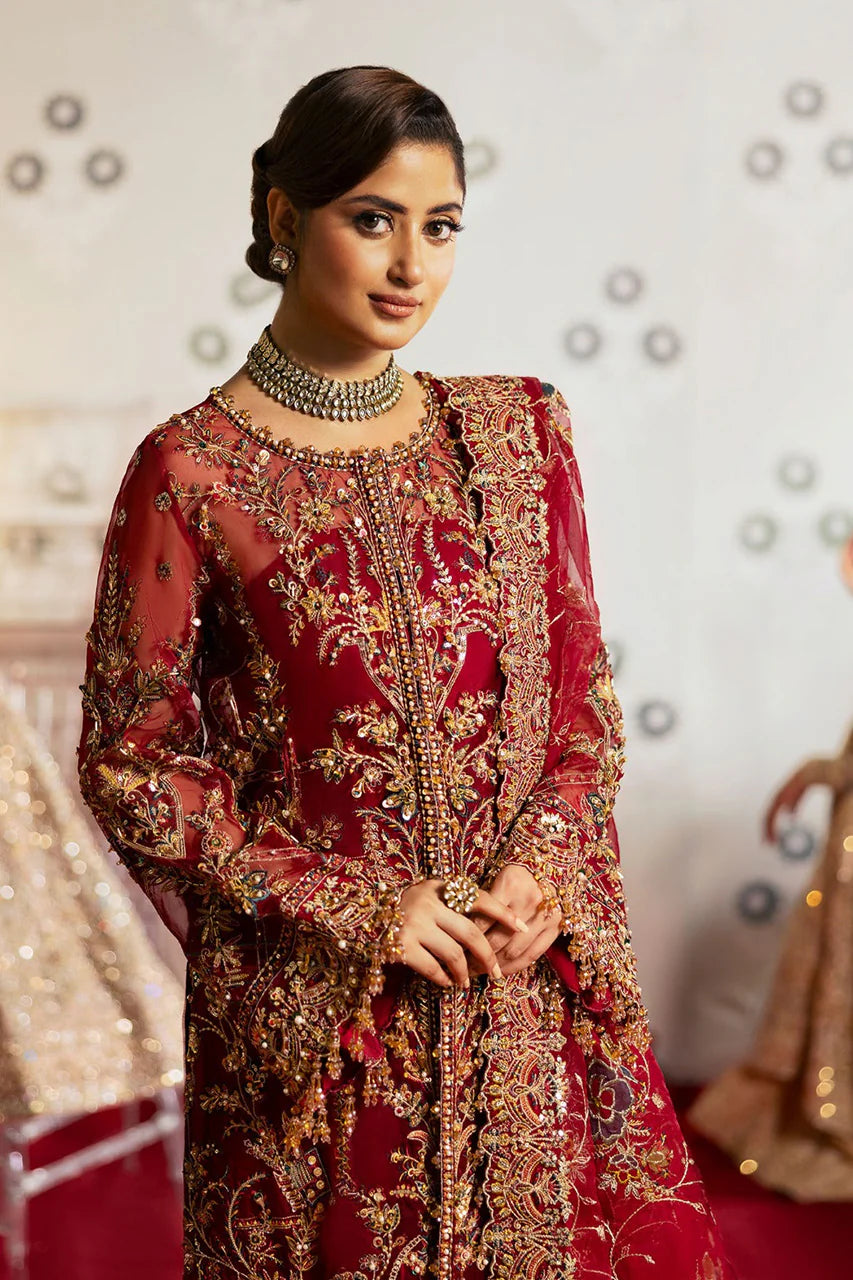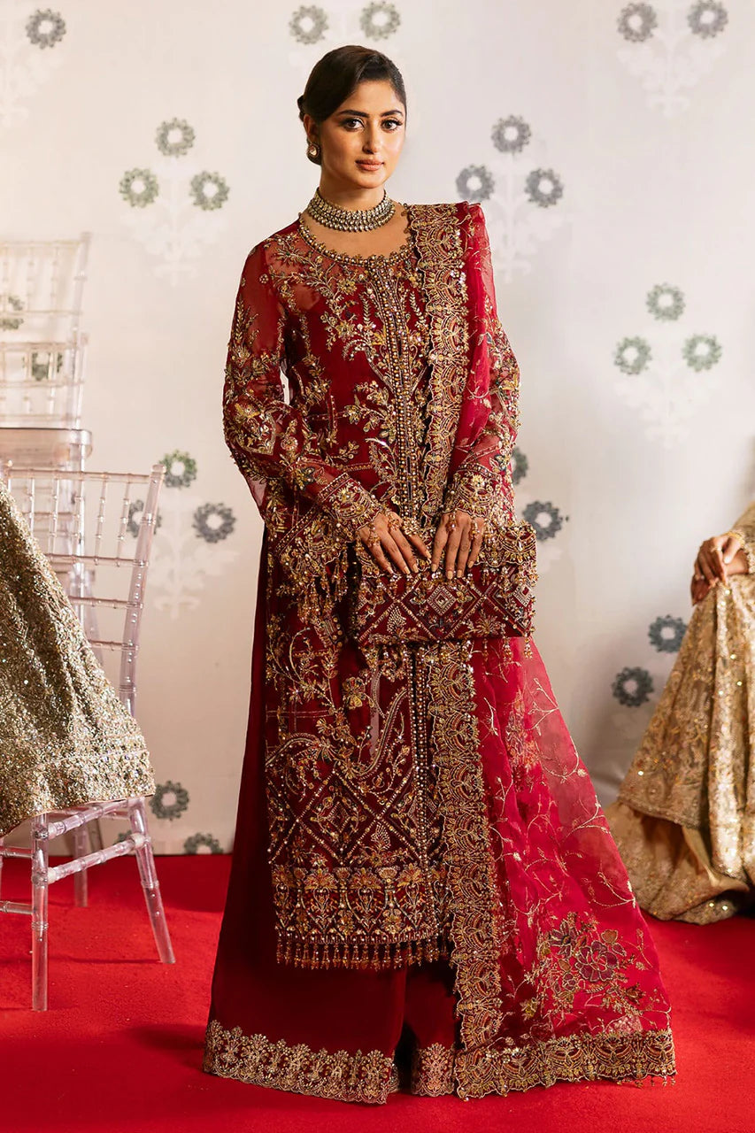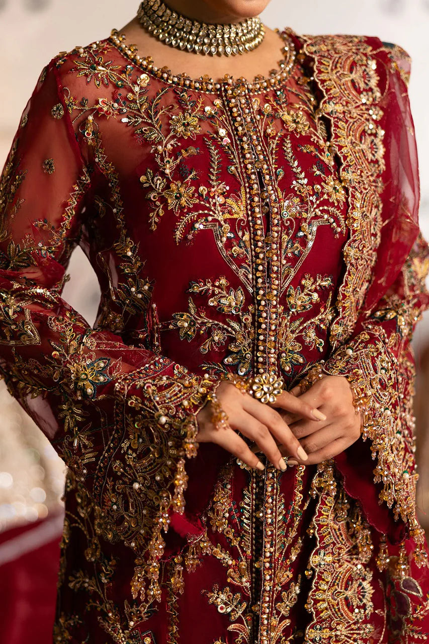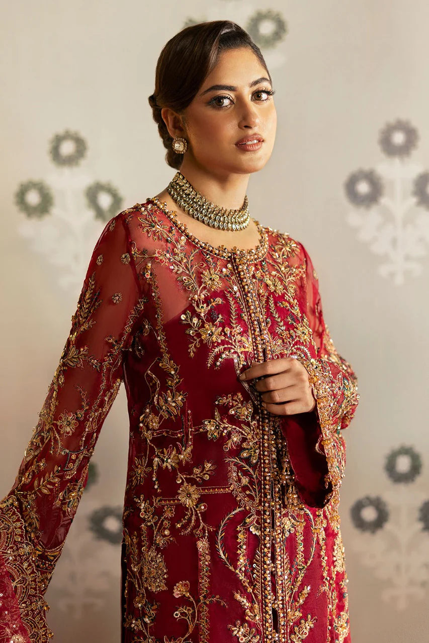 Make a bold statement in our radiant red front-open outfit, adorned with an enchanting blooming geometric pattern that captivates with its artistry. Accentuated by delicately hand-sewn pearls, crystals, and sequins, this ensemble exudes elegance and sophistication at every turn. The airy laser organza dupatta adds a whimsical touch, while the flair pants complete the look with a chic silhouette. Perfect for any festive occasion, this outfit promises to turn heads and leave a lasting impression, ensuring you shine brightly in every moment.