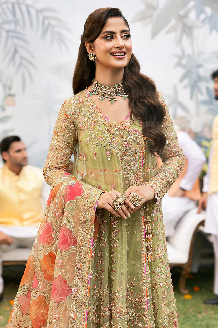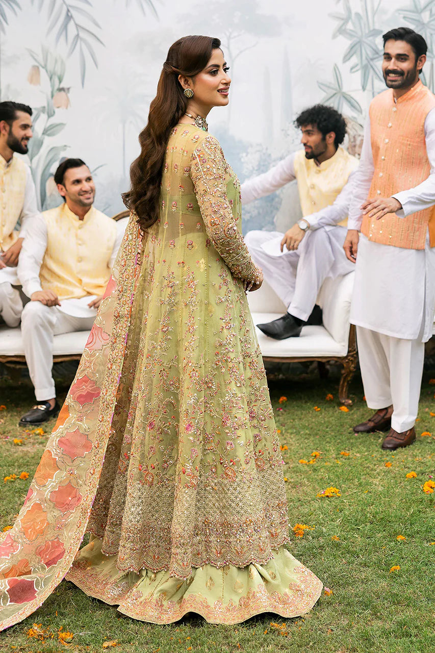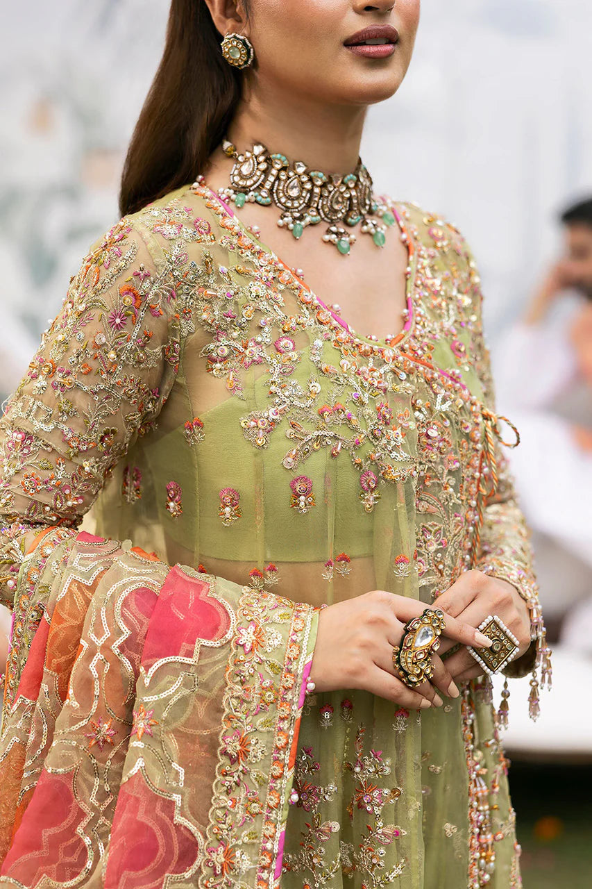 Elevate your festive wardrobe with our striking panelled angrakha in vibrant lime zest, featuring intricate embroidery and embellishments that shimmer with every movement. The long, flowing silhouette exudes grace, while the meticulously crafted dupatta with detailed laser work and elegant foil trousers perfectly blend tradition with contemporary style. Slip into this stunning ensemble from the Maahi Collection and prepare to captivate everyone around you, celebrating the artistry of craftsmanship and beauty.