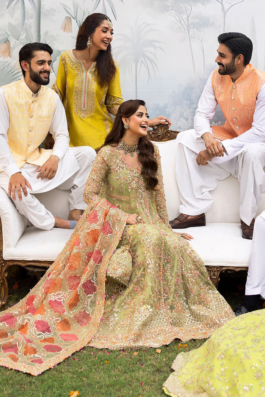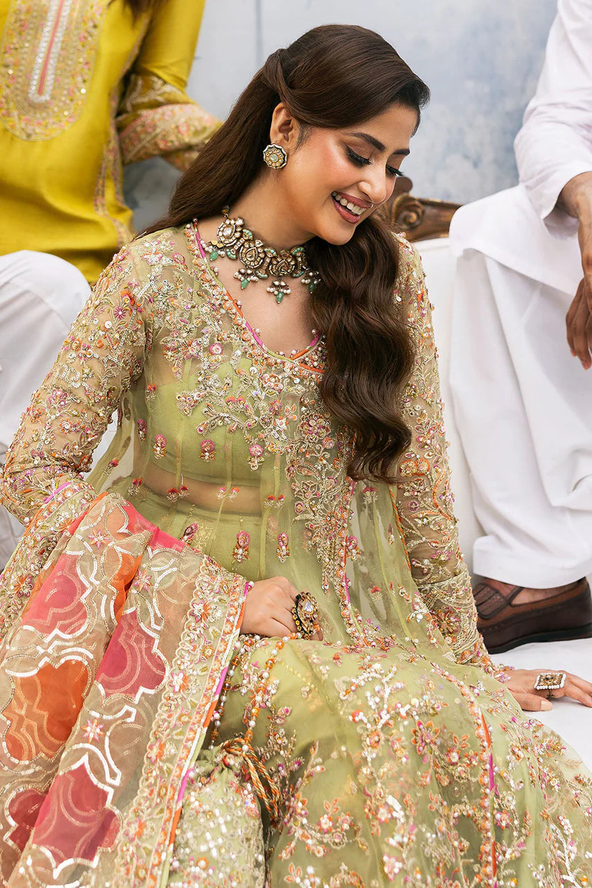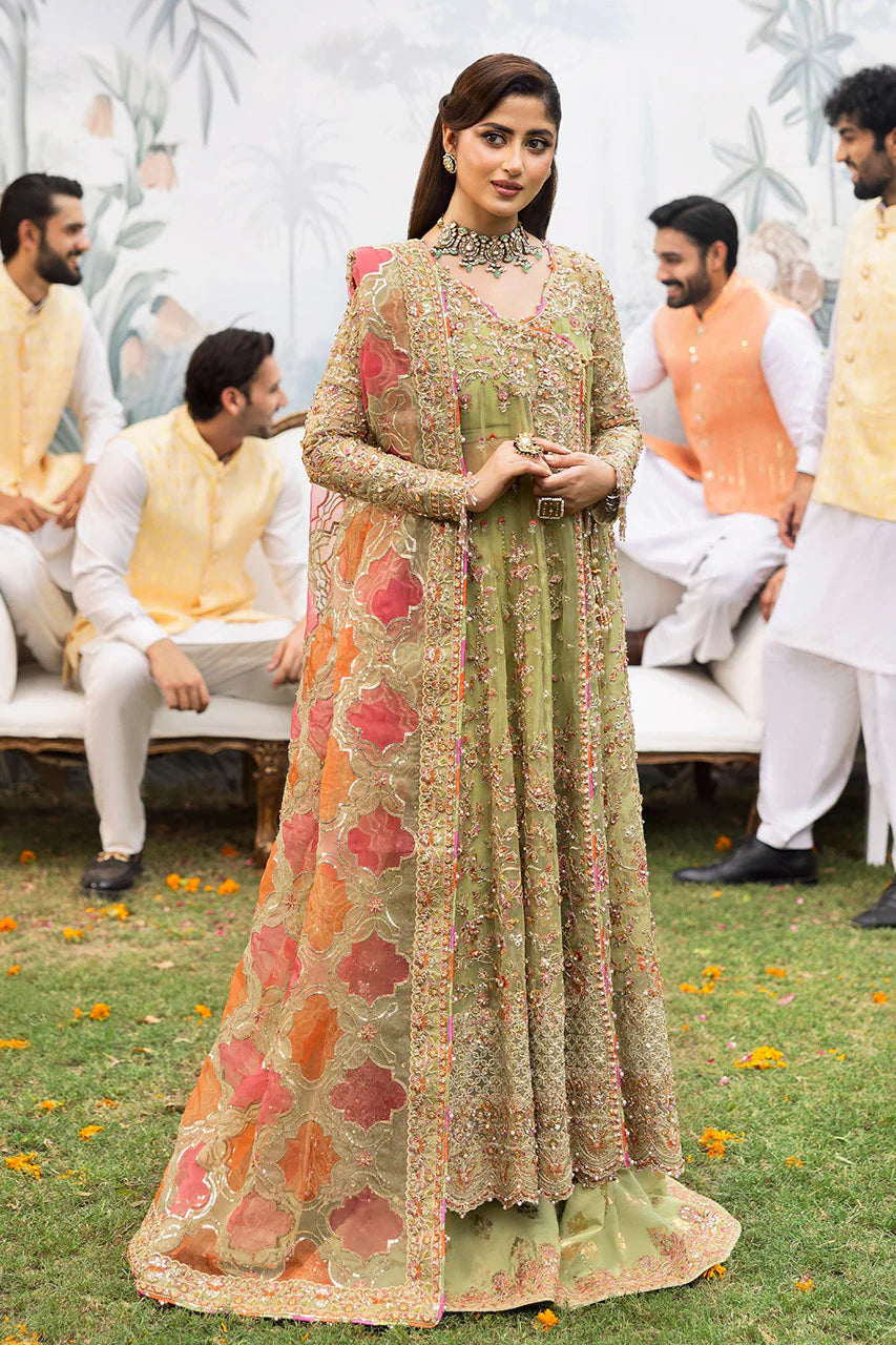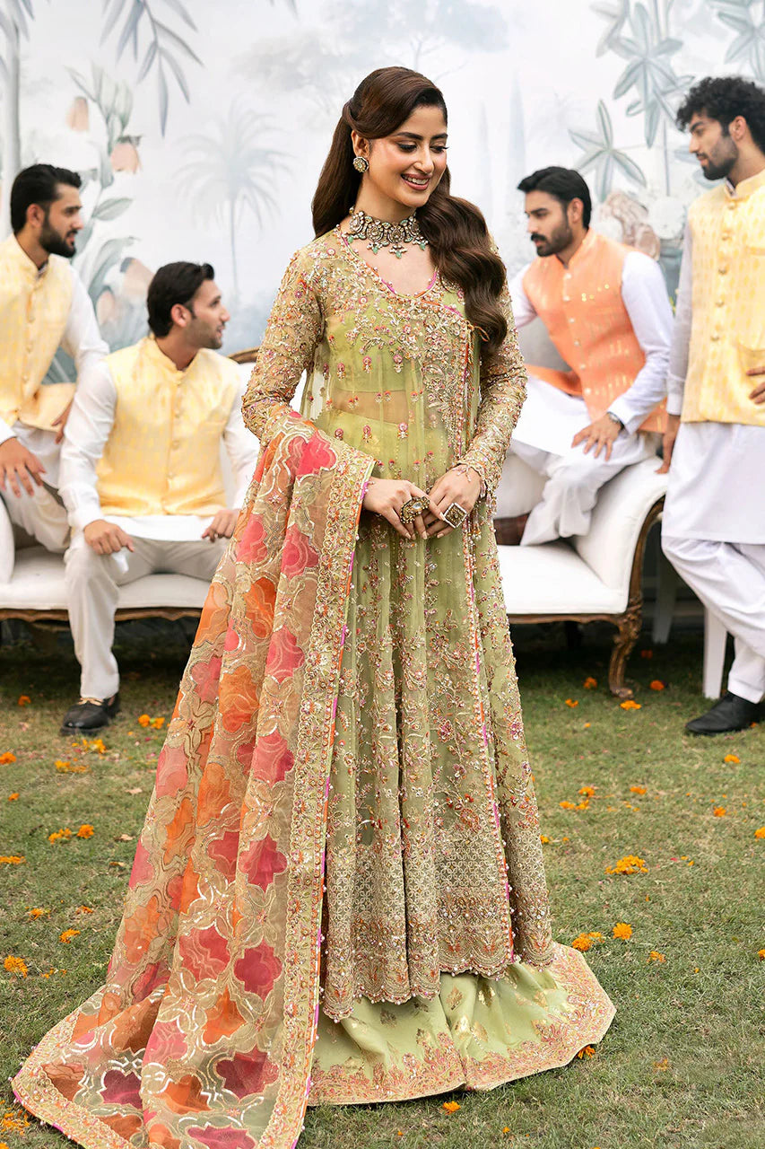 Elevate your festive wardrobe with our striking panelled angrakha in vibrant lime zest, featuring intricate embroidery and embellishments that shimmer with every movement. The long, flowing silhouette exudes grace, while the meticulously crafted dupatta with detailed laser work and elegant foil trousers perfectly blend tradition with contemporary style. Slip into this stunning ensemble from the Maahi Collection and prepare to captivate everyone around you, celebrating the artistry of craftsmanship and beauty.