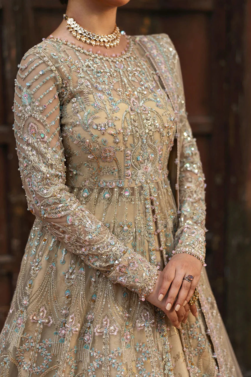 Experience timeless elegance with this exquisite nude front-open pishwas, crafted from delicate net for a captivating look. Paired with a soft pink lehnga featuring a beautifully embellished border, this ensemble effortlessly combines tradition and modernity. The net dupatta, adorned with a four-sided organza border in pink and blue, adds a vibrant touch to the outfit. Light gold embroidery and sequins lend an air of sophistication, making this ensemble perfect for any special occasion. Embrace the charm of this stunning creation and radiate grace at every event.