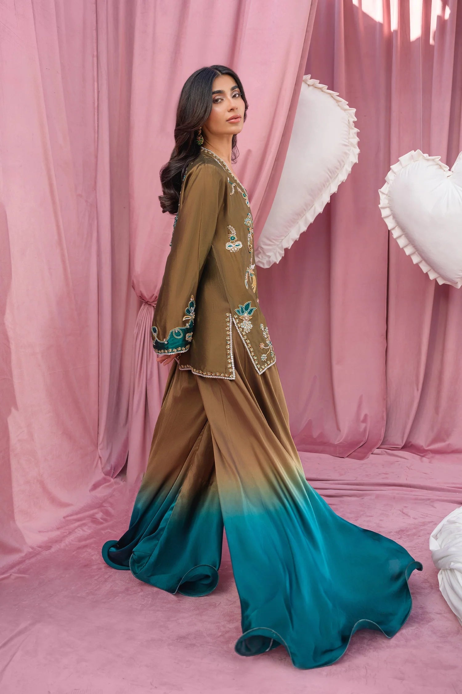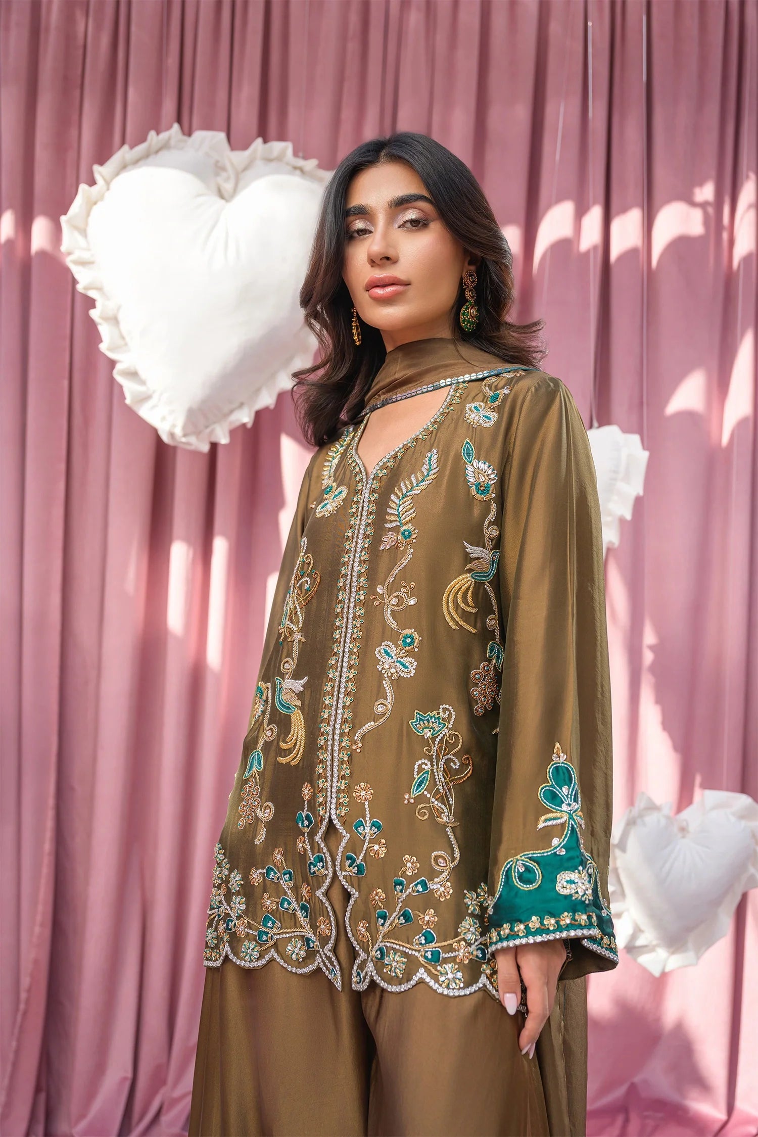 A short dusty olive jacket, exquisitely tailored in pure sheesha silk, is paired with fluid ombré charmeuse silk pants in deep hues of maple and emerald green. The ensemble is adorned with intricate dabka, kora, and resham embroidery forming elegant peacock motifs. A medium silk dupatta completes the look and is paired separately. -Inner is included and comes unattached.