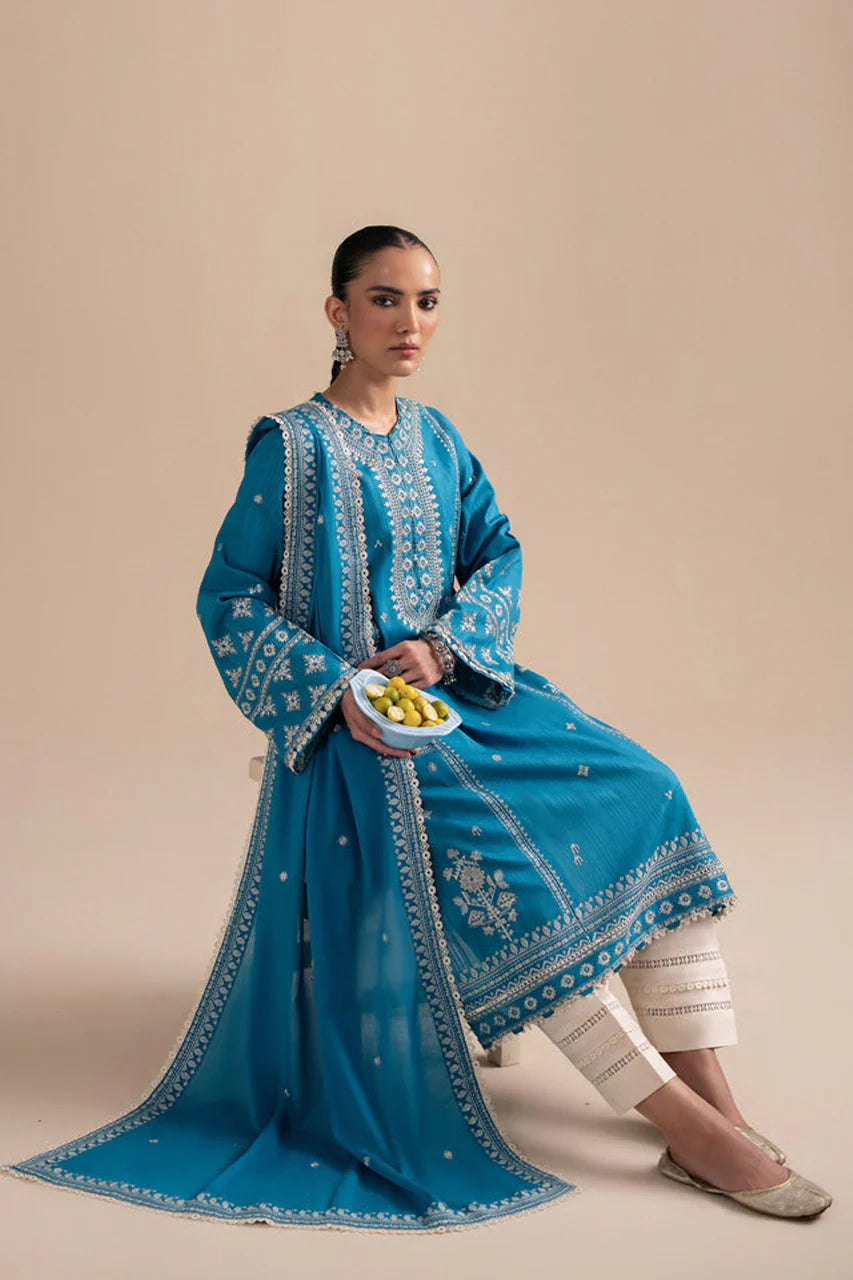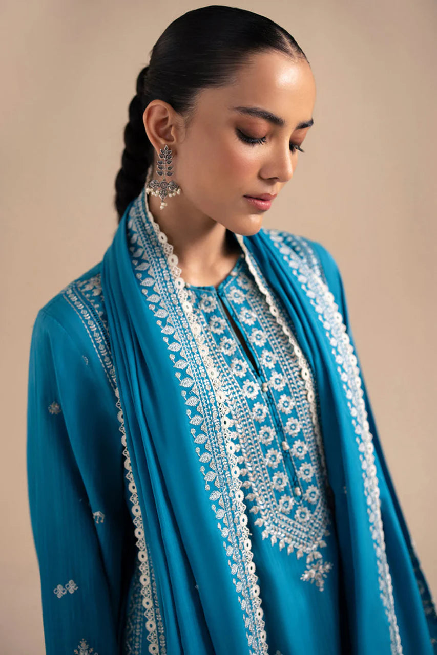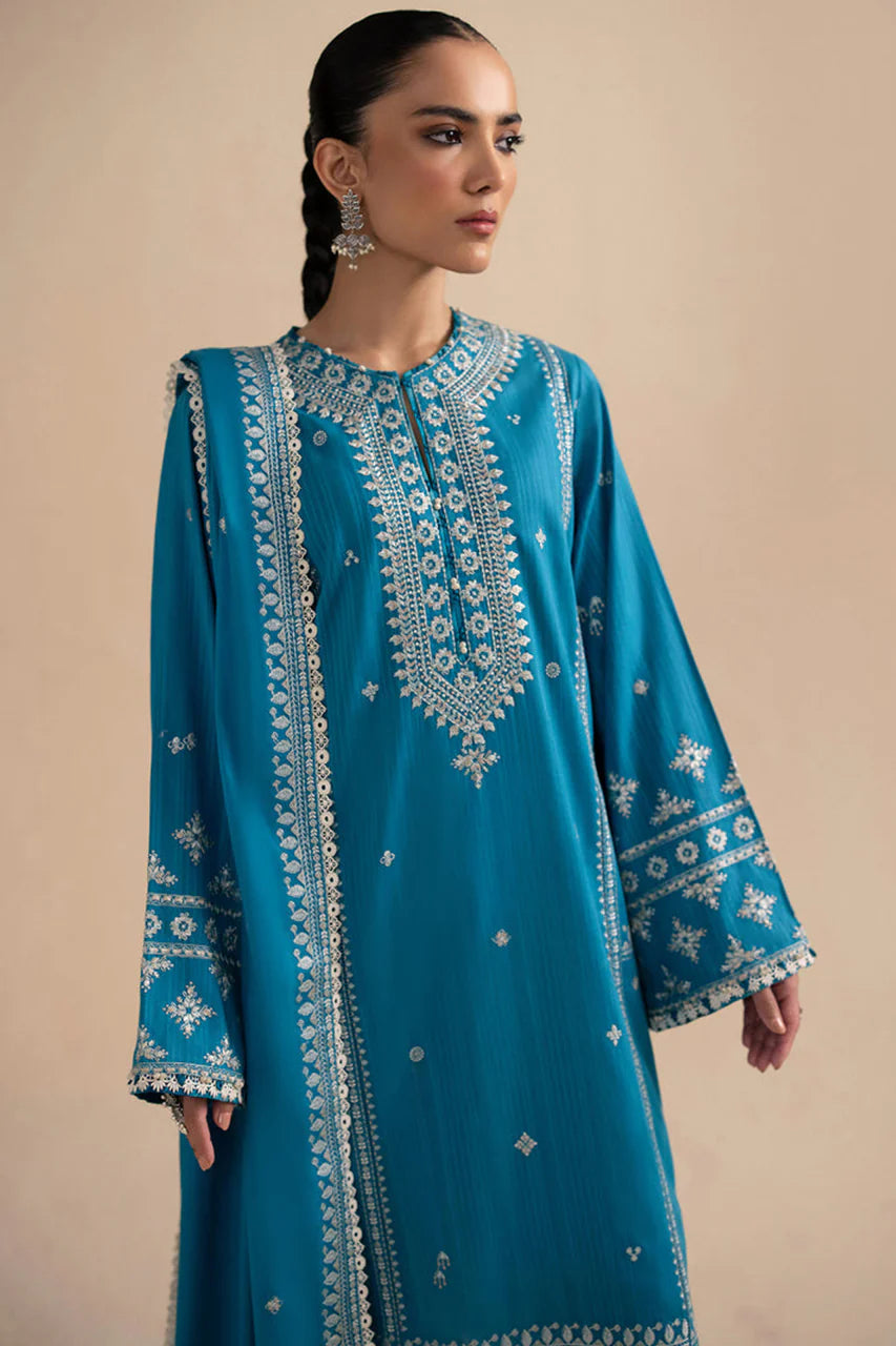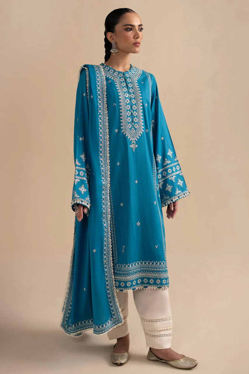 Introducing the enchanting ‘Marmar,’ a captivating autumn ensemble crafted from a warm aqua canvas, adorned with intricate ivory embroidery. This exquisite piece exudes regal sophistication, with meticulous detailing that enhances its graceful elegance against the backdrop of fall’s cozy charm.Paired with a tonal dupatta featuring beautifully embroidered borders, ‘Marmar’ embodies understated luxury, making a statement of timeless allure. In ‘Marmar,’ you embrace the rich beauty of the season, where crisp air and vibrant leaves converge, inviting endless possibilities for stylish layering and seasonal warmth.