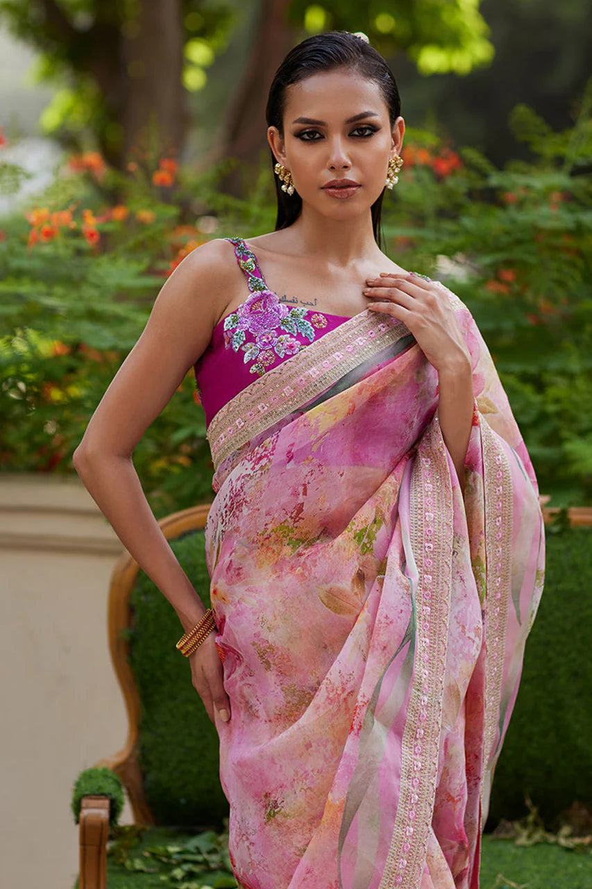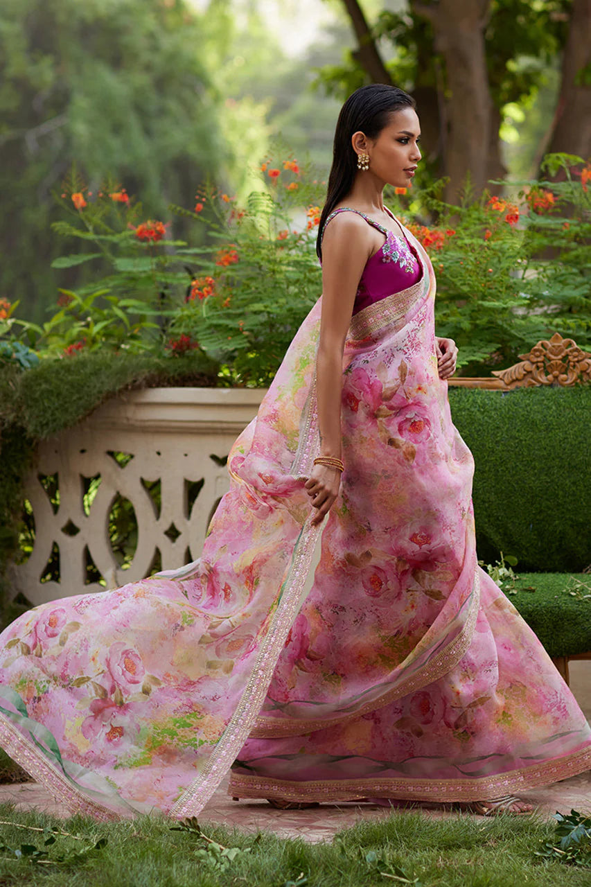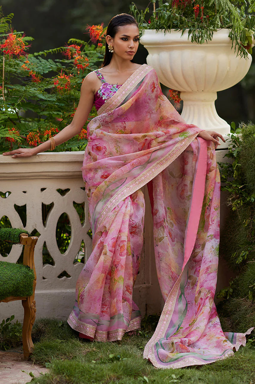 This timeless silhouette is given a contemporary twist as it is digitally printed with fresh florals, blooming delicately all over. Cut from floaty organza that’ll have you feeling like a fairy and trimmed with a delicately embroidered border, the simplicity of this saree speaks volumes. Paired with a stunning blouse, cut from pure raw silk, adorned with gorgeous sequined blooms, this is just an absolute must have.