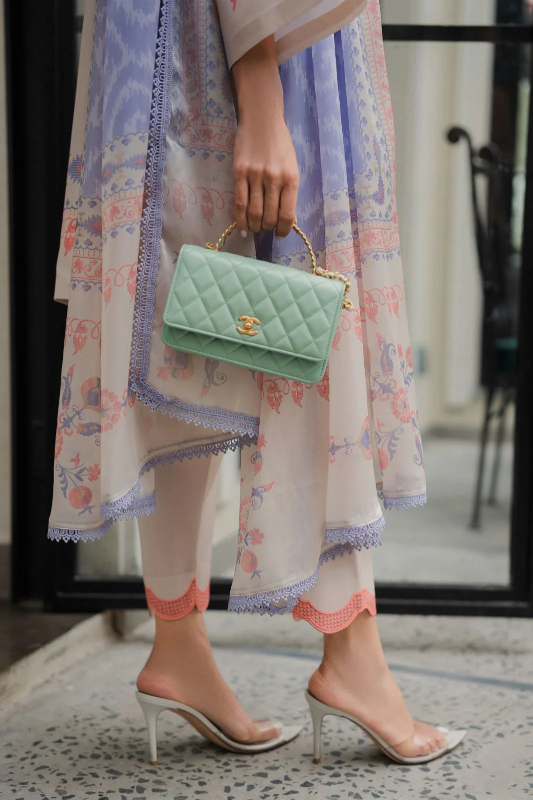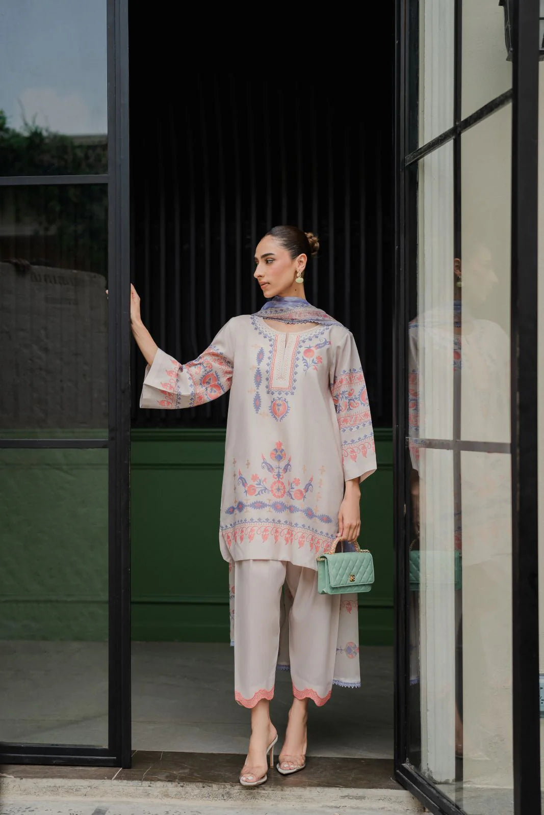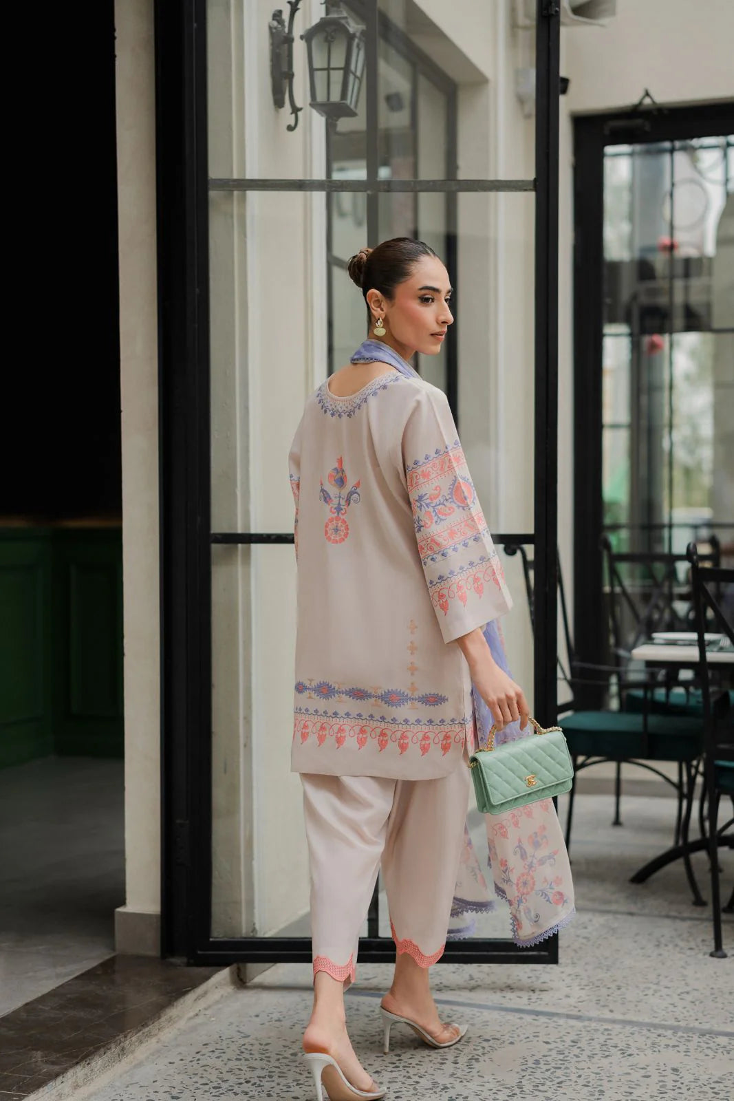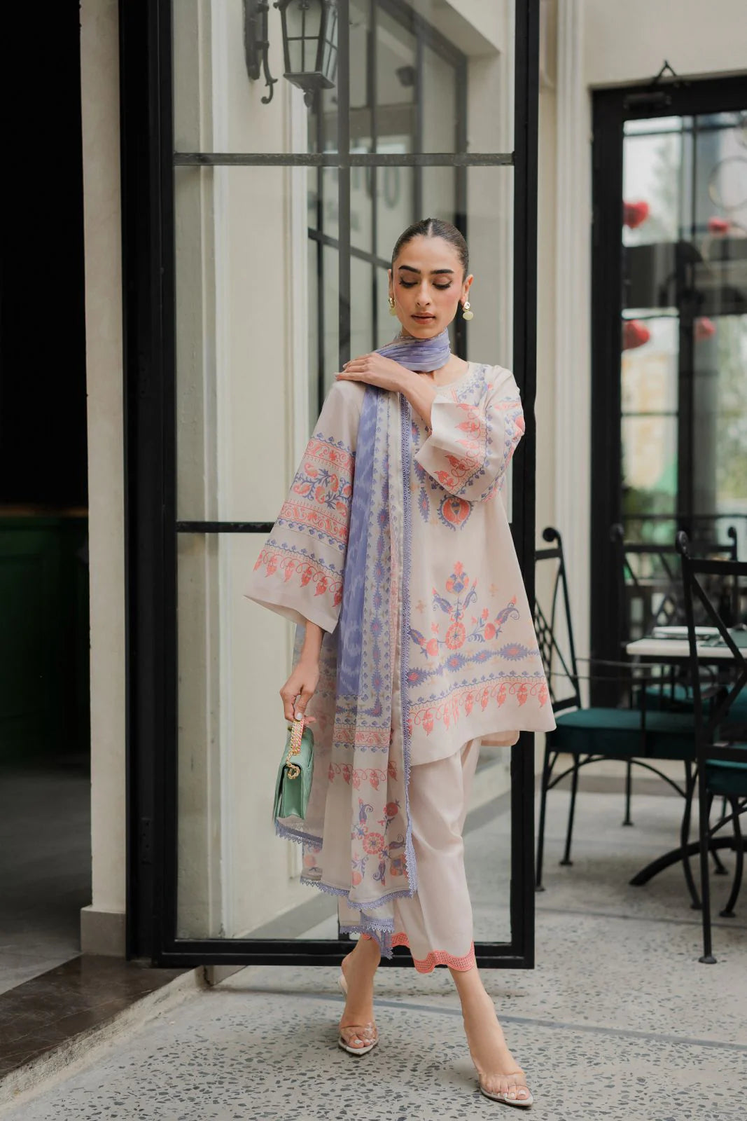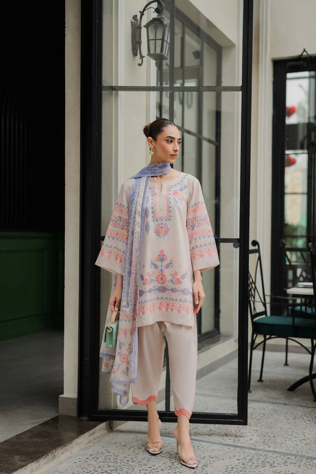Meera is a printed two piece outfit stitched beautifully with scallops on pants. Dupatta can be added as add ons.