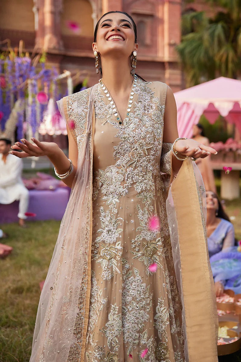 Introducing our meticulously crafted outfit, Meherbano, which presents a harmonious masterpiece of intricate artistry, redefining opulence through its enchanting charm in beige chiffon pishwas. The fusion of meticulously adorned hand embellished and embroidered details coupled with intricate tilla and mirror lace finishing creates a seamless harmony between traditional artistry and modern elegance.