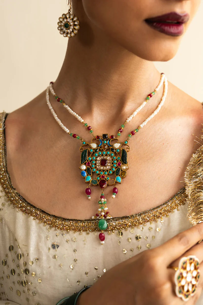 This handcrafted piece features an exquisite blend of emerald green carved stones and mother of pearl, paired with ruby, feroza, and agate accents.Strung with yellow sapphire, lapis lazuli, and natural pearls, it’s finished with ruby and emerald threads.