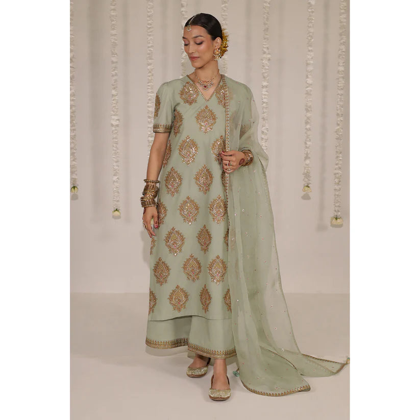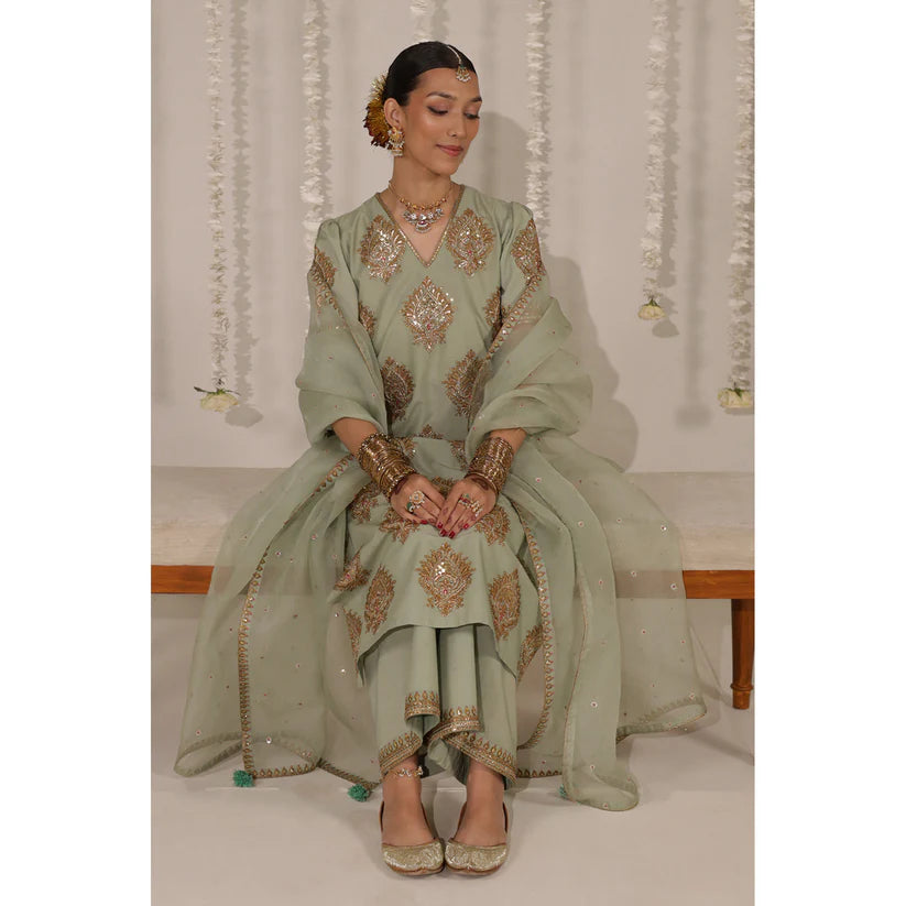 Mint Green cotton shirt and culottes with badla and tambako tilla embroidery and an organza dupatta.