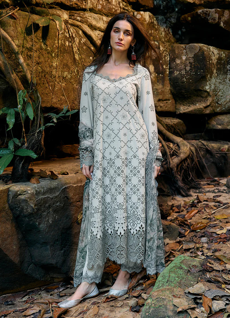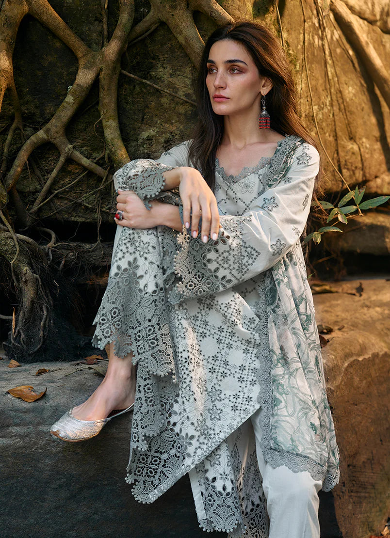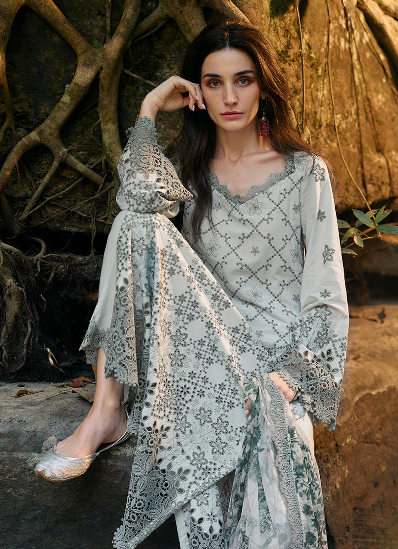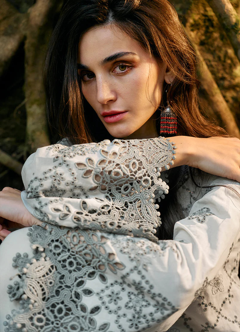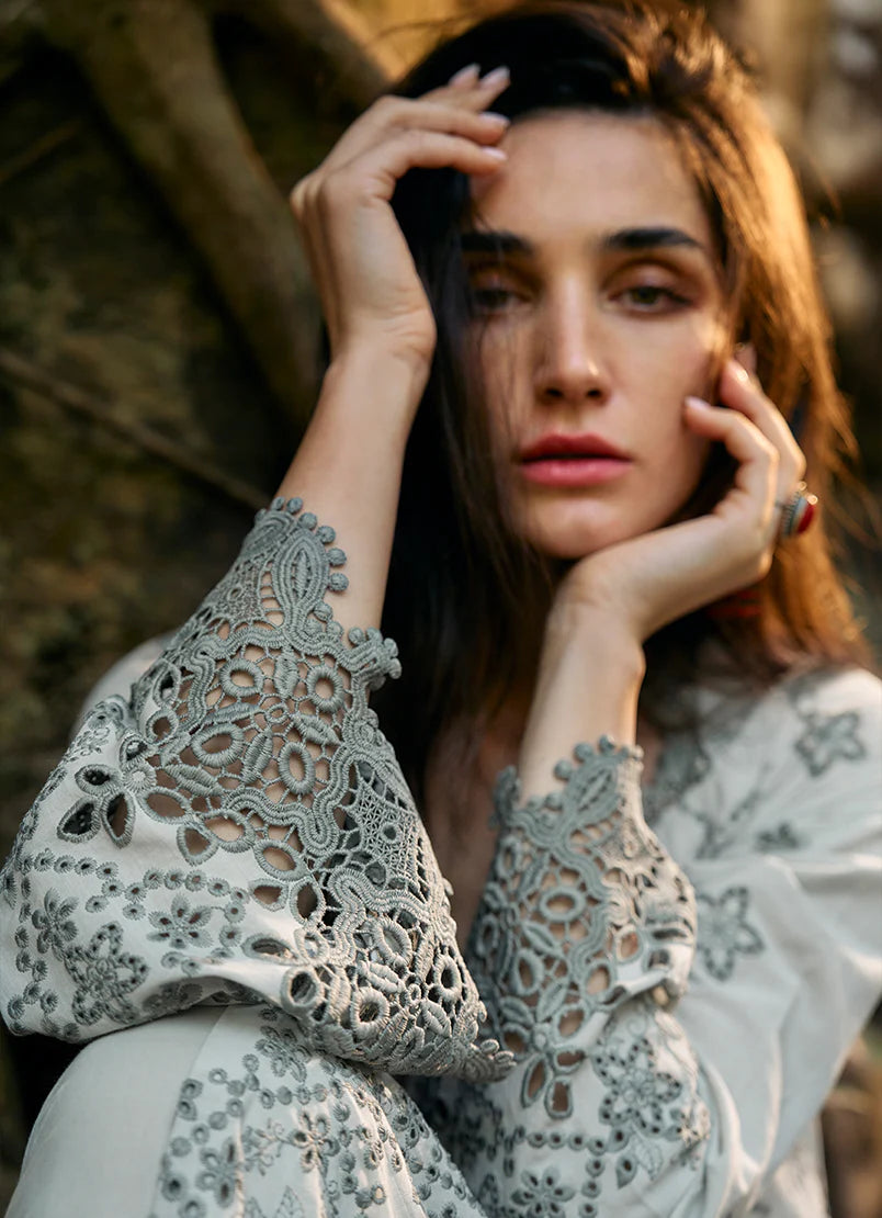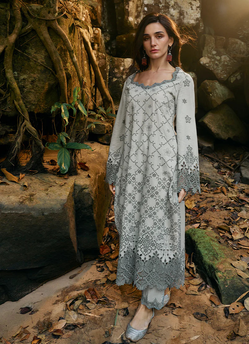 Mirha features an embroidered trellis pattern on bird blue grey fabric embellished with heavy Guipure lace appliqued on to the shirt hemline, sleeves, and matching trousers.
