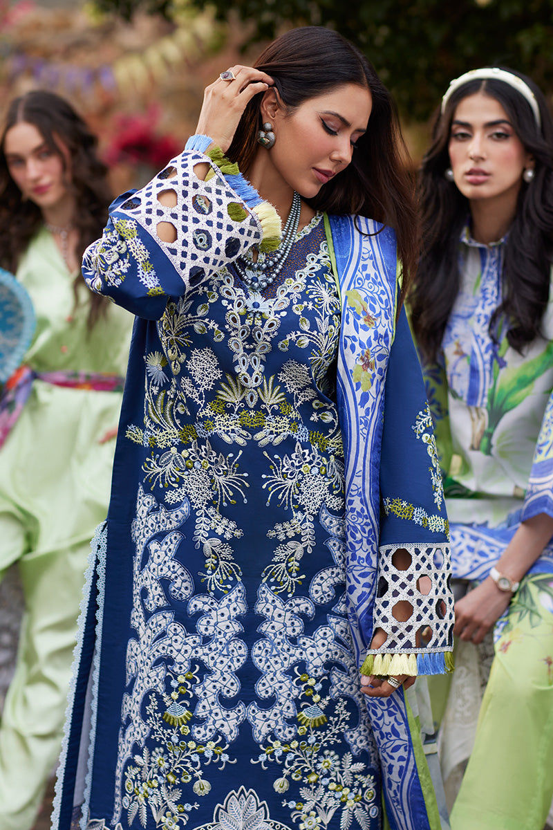 "Modena Magic" in mesmerizing blue, where elegance meets allure in every stitch. The chikan embroidered front and back exude an air of refinement, while the appliqued lawn back adds depth and texture to the ensemble. Adding to its allure is the digital print pure silk dupatta, featuring a captivating design that complements the intricate embroidery perfectly.