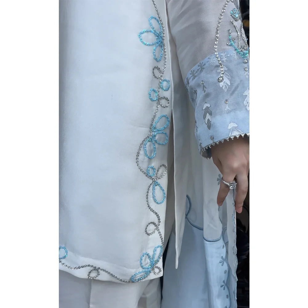 This pearl white short shirt ensemble is a true definition of a timeless classic attire . The Shisha silk shirt features a trendy neckline with vibrant powder blue crystals , beads along with silver swarovskis , gems and sequins handwork . Side Seams of the kurta is adorned with beautiful handwork . Sleeves have stunning block print and handwork details .Paired with a flawlessly tailored karri shalwar that also includes the handwork motif and an medium silk dupatta that is a finished with intricate scalups embrioderey and exquisite blooming corners, this look is truly not one to miss out on.