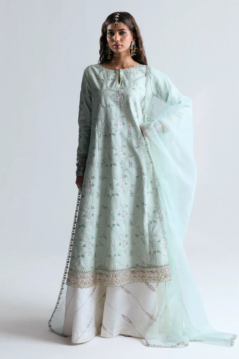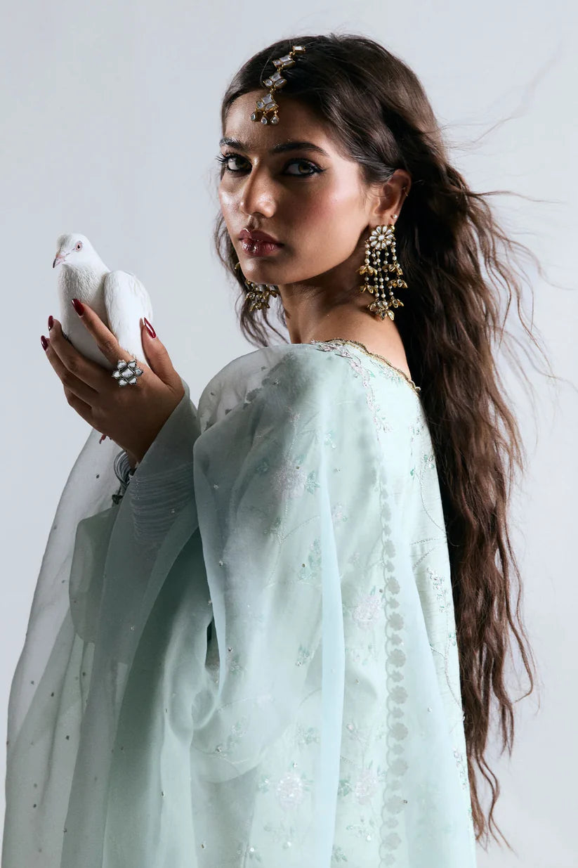 Our aqua Motia long shirt is adorned with delicate floral embroidery and a scalloped organza neckline, with intricate adda work. The sleeves and hemline are finished with floral organza borders, each bloom embellished with meticulous naqshi details. It is paired with an ivory sharara featuring graceful diagonal embroidered lines. The look is completed with an airy aqua organza dupatta, dusted with an all-over sequin spray.