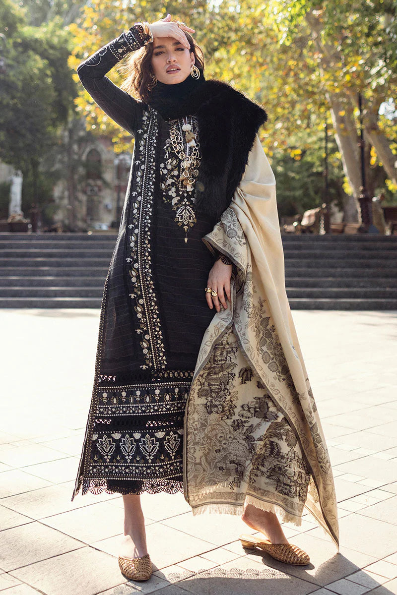 Twisted Affection in striking black features a beautifully embroidered checkered karandi shirt, exuding elegance and sophistication. Paired with a warm woolen shawl, this ensemble is enhanced by delicate crochet lace finishing and handmade wool thread tassels, adding an artisanal flair.