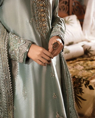 Draped in luxurious silk, this ensemble from our collection boasts intricate hand-embellished details, featuring delicate gold threads that dances across the ensemble, adding a regal touch to every stitch.