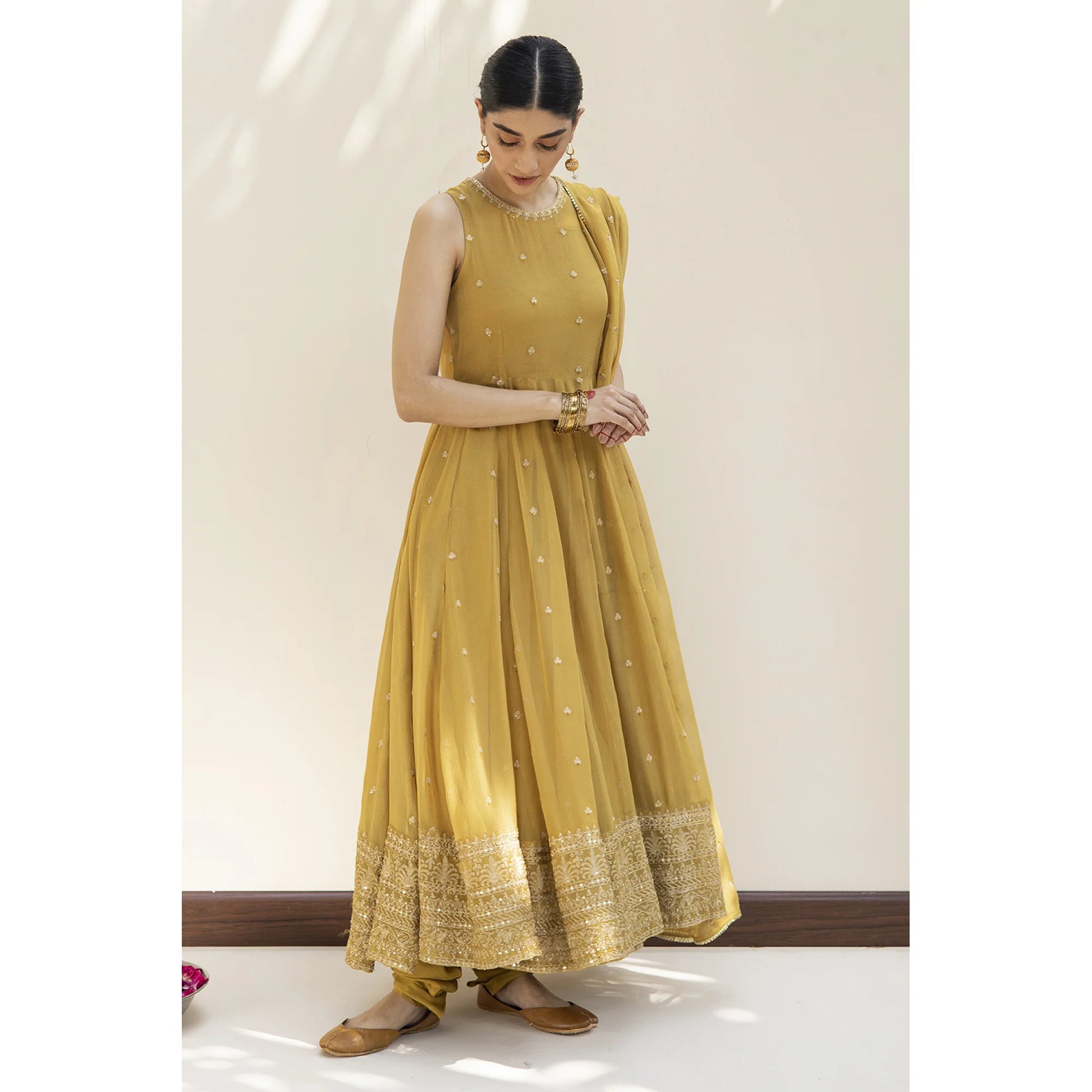 Visually pleasing subtle mustard kalidaar with a beautiful intricate wide tilla border paired with tilla and sequin spray splashed all over and is finished with gotti lace which compliments the outfit.