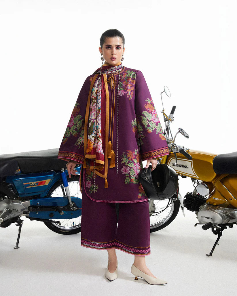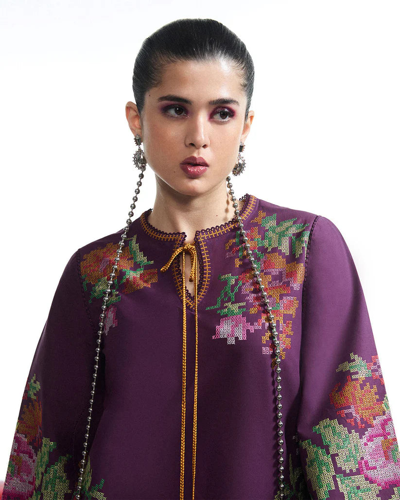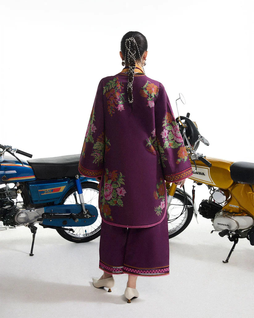 This striking ensemble features a deep purple short shirt, richly adorned with multicolored cross-stitch embroidery, celebrating traditional technique with a contemporary edge. The bell sleeves, echoing the same vibrant embroidery, are finished with graceful tassels that add texture and charm. Paired with matching purple culottes, also embroidered in vivid cross-stitch patterns, the outfit offers a cohesive and artistic silhouette. A digitally printed silk scarf, light and fluid, completes the look with its intricate design and delicate tassels, adding a touch of elegance and modern flair.