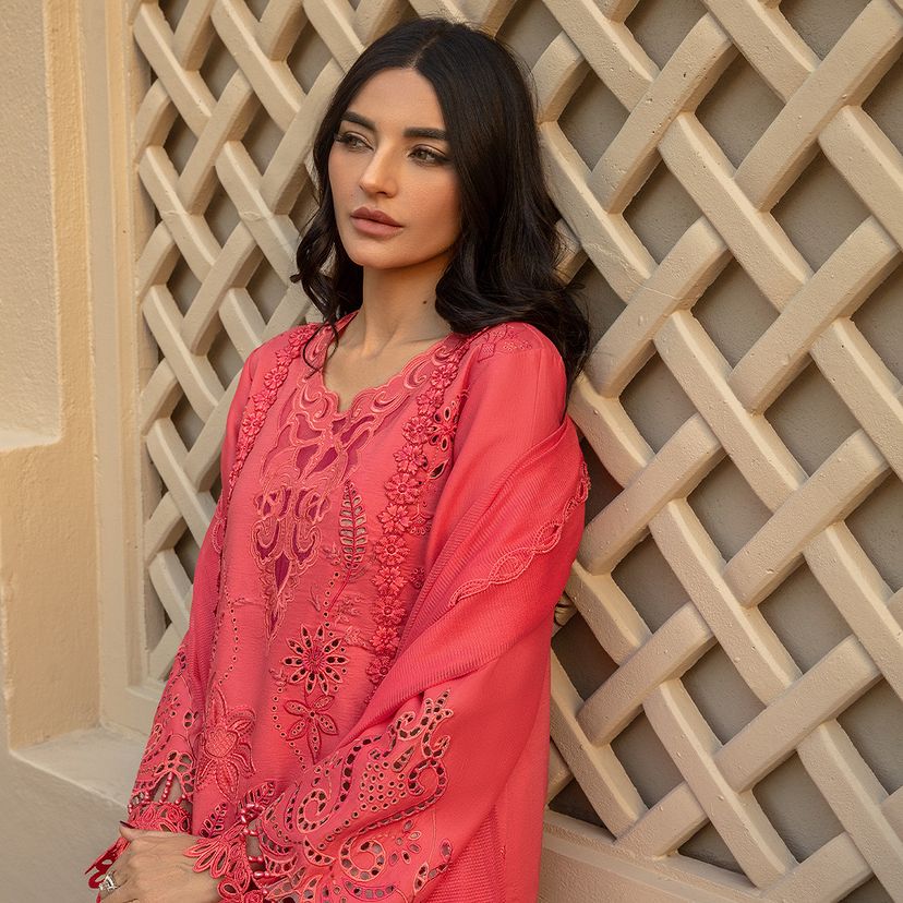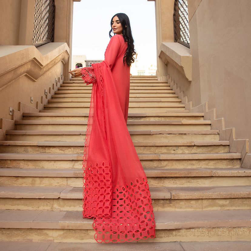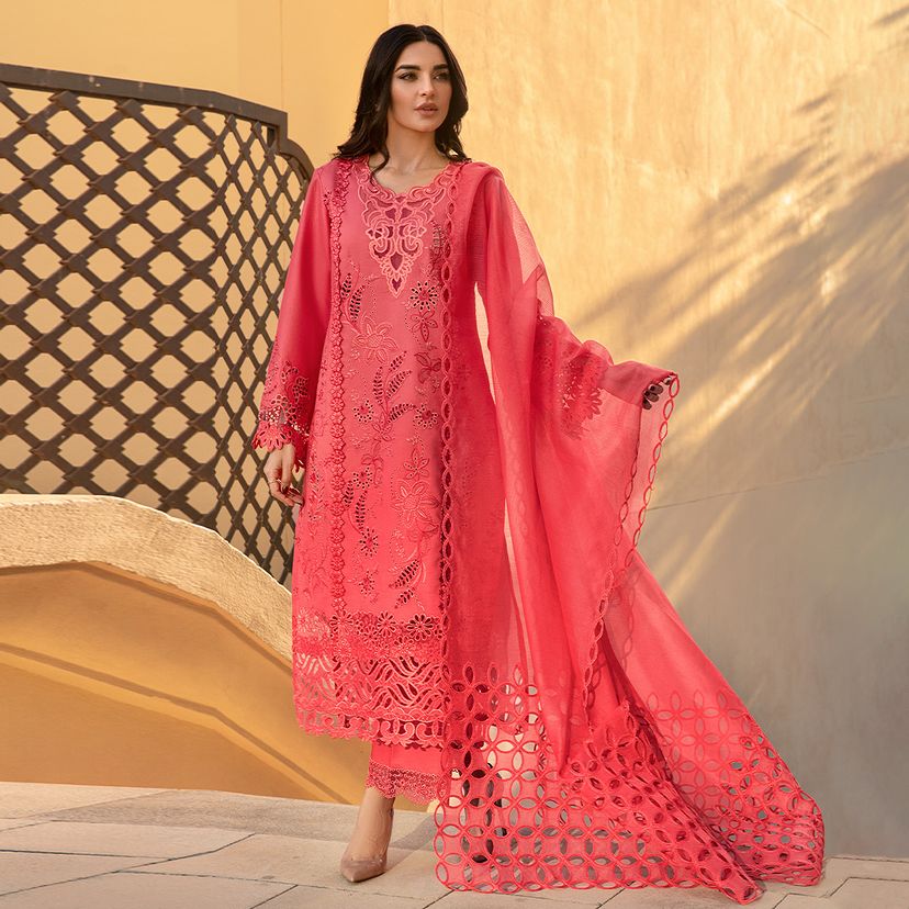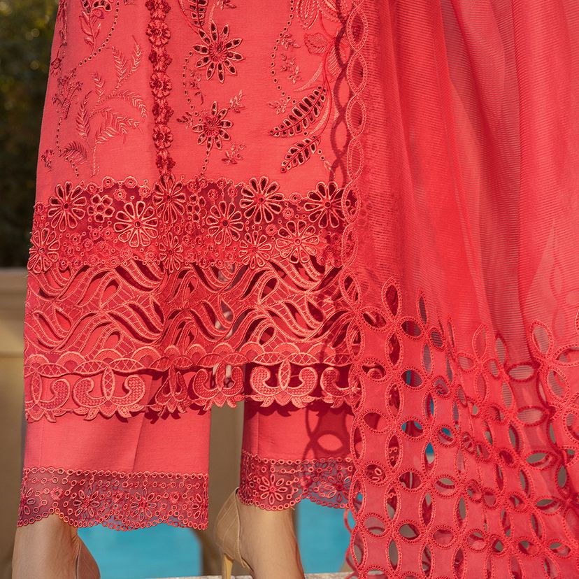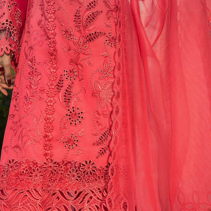 Natalia | Indulge in exquisite craftsmanship with our laser-cutwork embroidered ensemble. The shirt’s center, left, and right panels on dyed lawn showcase intricate detailing, complemented by a dyed lawn shirt back. The sleeves feature delicate embroidery on dyed lawn, and embroidered borders on dyed organza add an elegant touch. Elevating the ensemble, embroidered trouser lace on dyed organza and additional lace on the shirt front enhance its allure. The dyed organza dupatta, adorned with an embroidered pallu, perfectly pairs with the dyed khaddi net and complements the ensemble. Paired with dyed cotton trousers, this ensemble is a symphony of refined artistry and timeless grace.