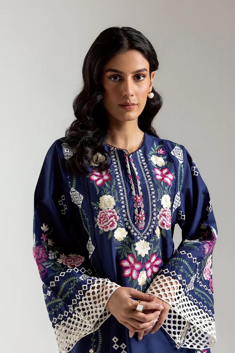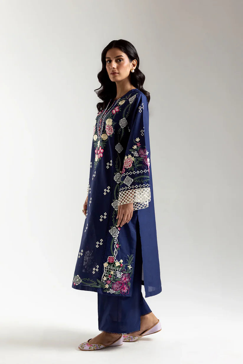 Immerse yourself in the rich allure of this deep navy blue embroidered ensemble. The kurta is a canvas of intricate floral and geometric embroidery, featuring a vibrant palette of pinks, whites, and greens that beautifully contrast against the deep base. Delicate white detailing and subtle embellishments add further texture and visual interest. The long sleeves are finished with an elegant, crocheted white border, adding a touch of refined artistry. Paired with matching navy blue trousers, this ensemble exudes a sophisticated and culturally rich aesthetic, perfect for special occasions where you want to make a statement.