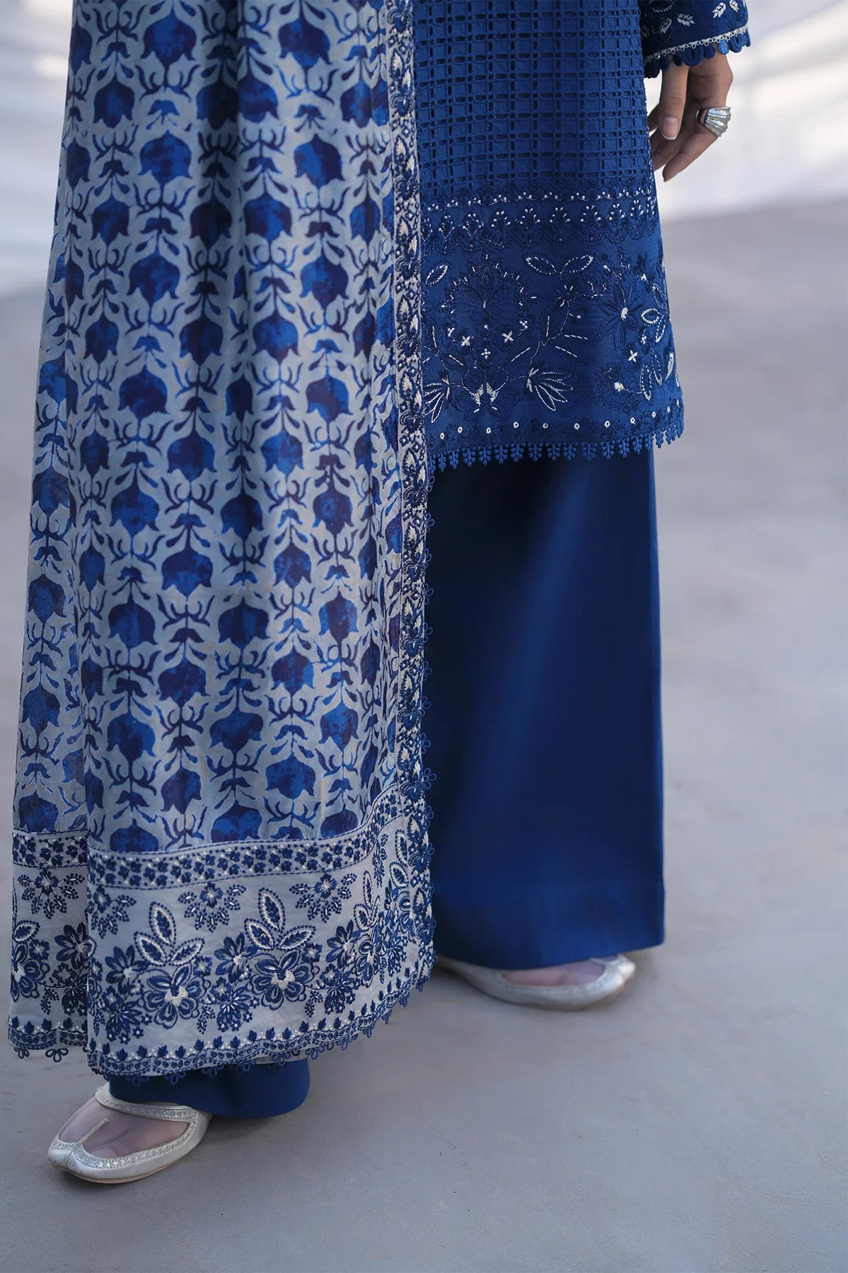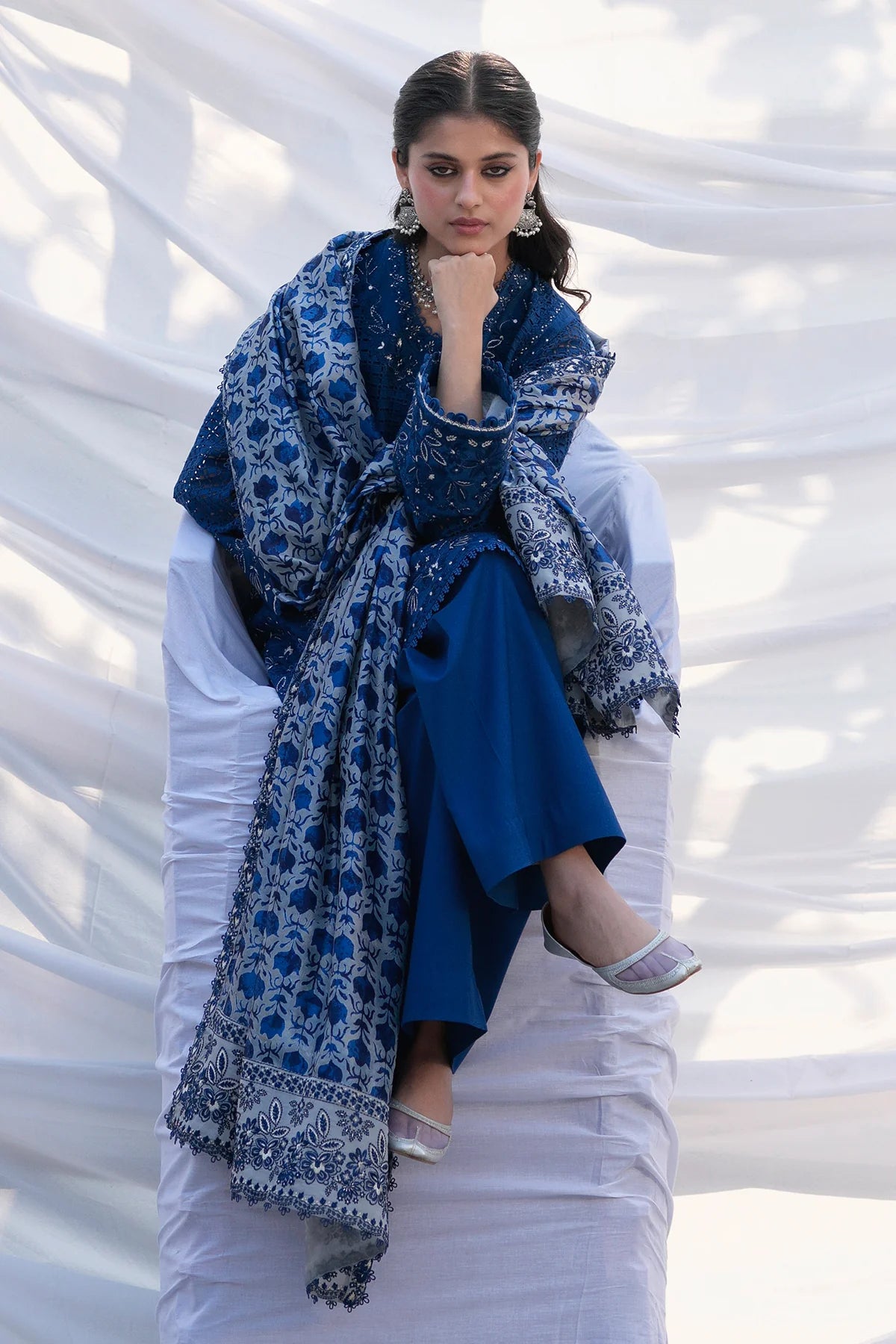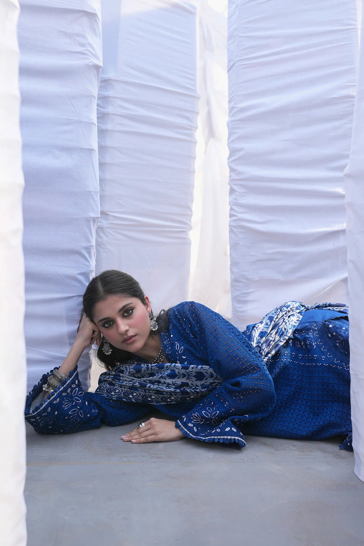 A regal Ink blue ensemble featuring an intricately cutwork embroidered kurta with farshi shalwar, and a beautifully detailed silk dupatta, perfect for festive elegance.