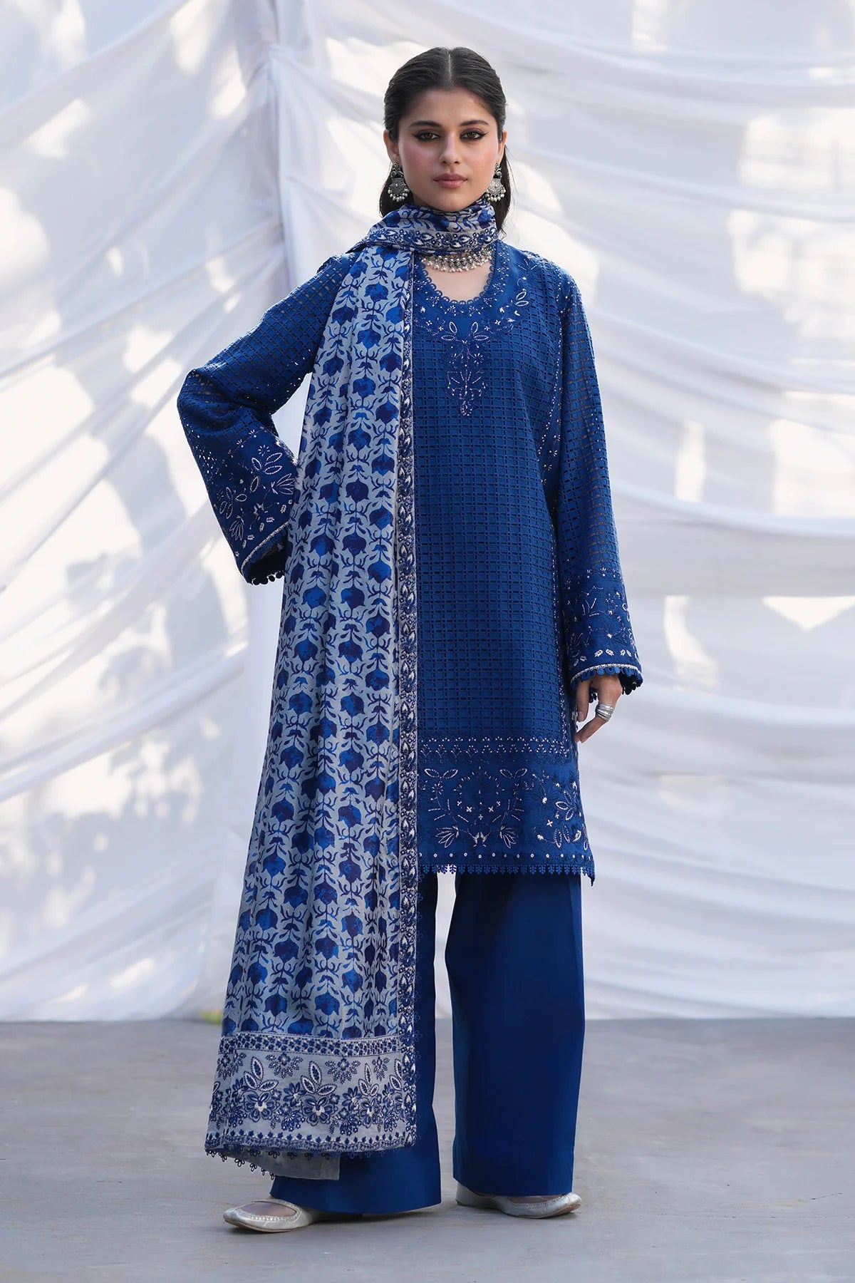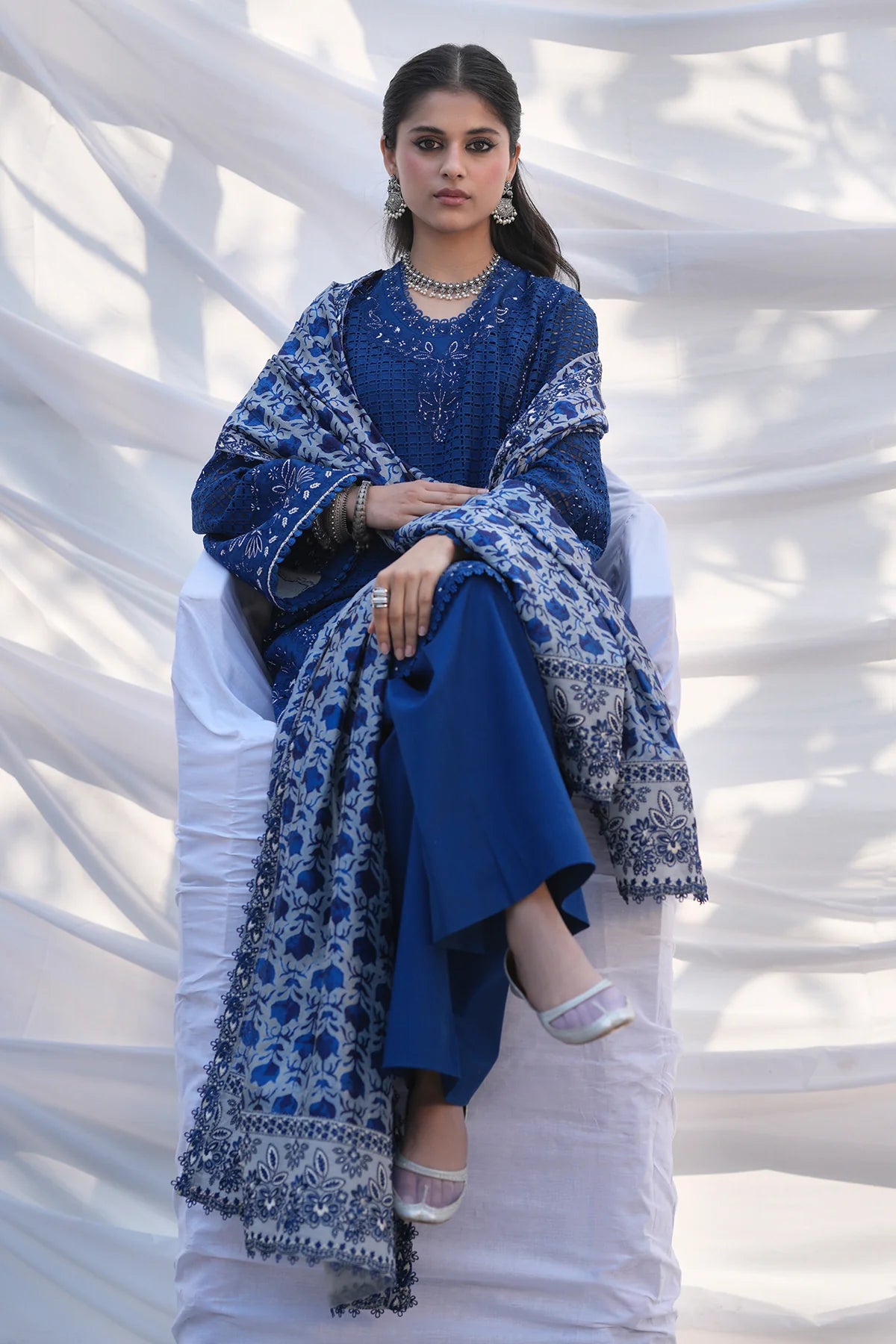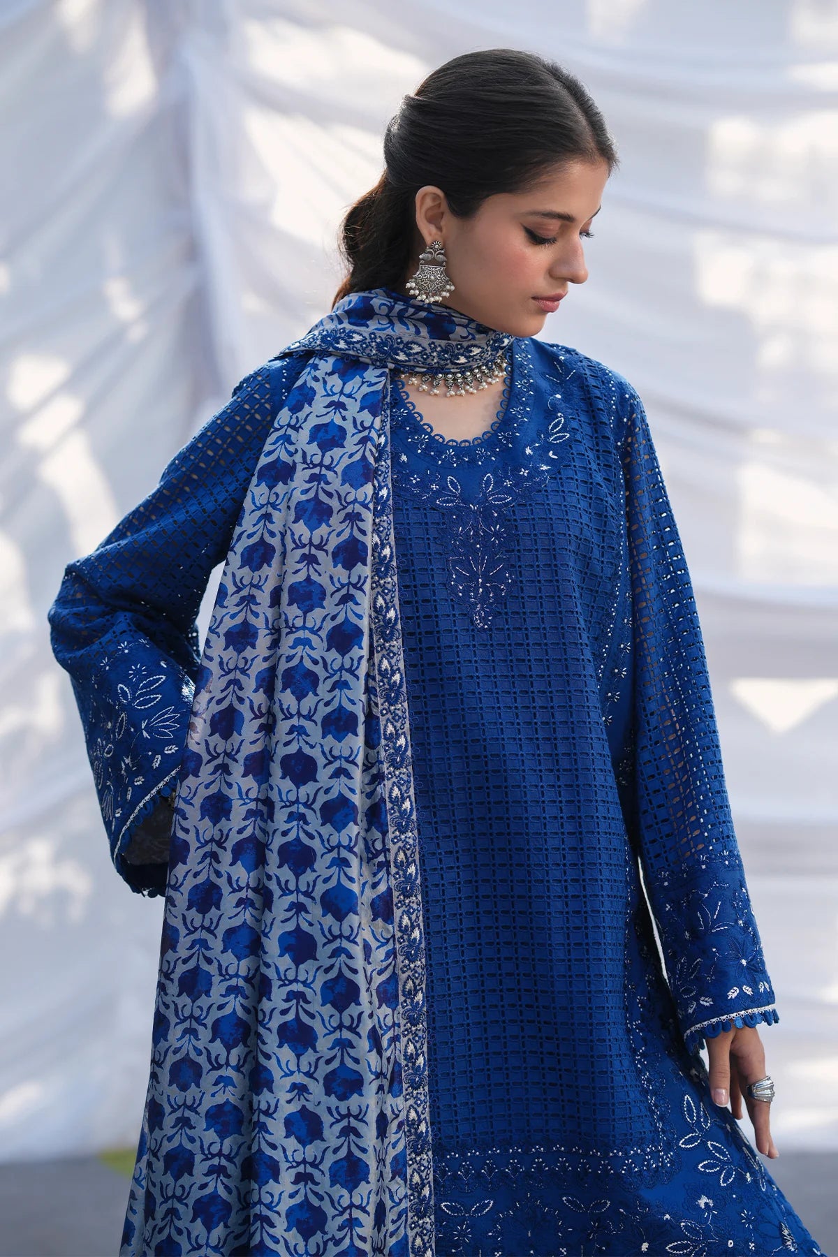A regal Ink blue ensemble featuring an intricately cutwork embroidered kurta with farshi shalwar, and a beautifully detailed silk dupatta, perfect for festive elegance.