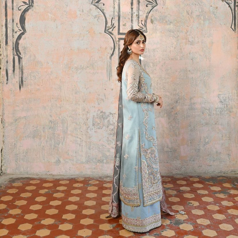 A hint of pink, a touch of gold, and beauty untold, this ensemble is a work of wearable art. Gleaming mirror work, gotta embroidery and cutwork blossom across the yoke and sleeves in a floral fantasia of pink and gold. More blossoms bloom along the dupatta border, while tassels sway gently from its edges. The trouser, too, bursts into bloom with block-printed flowers.