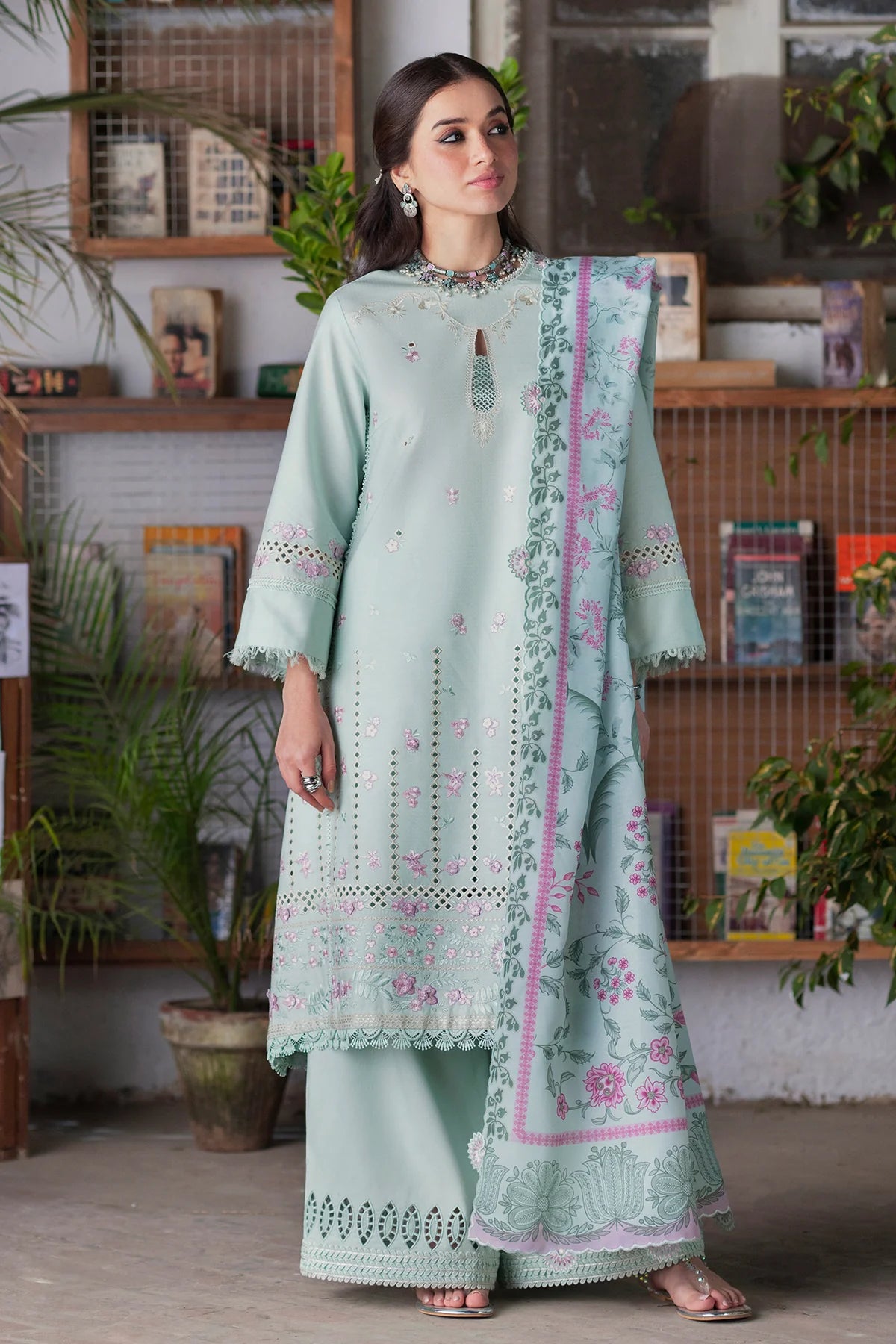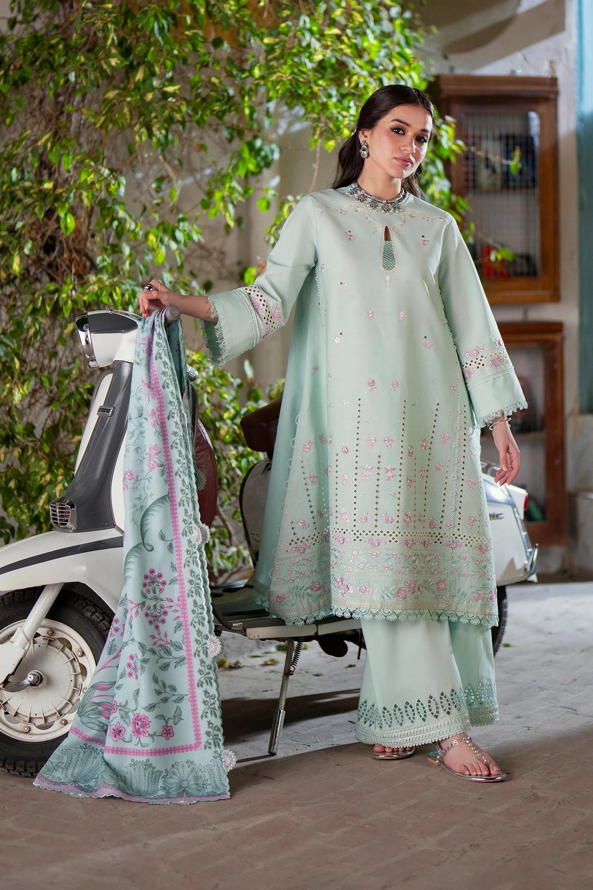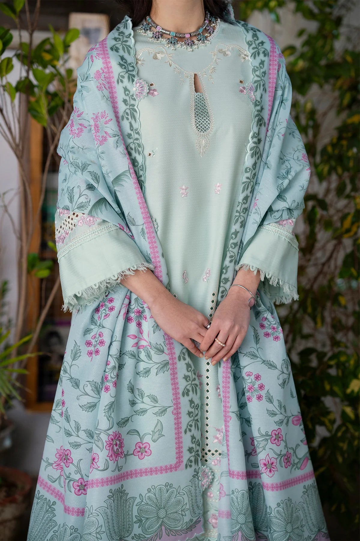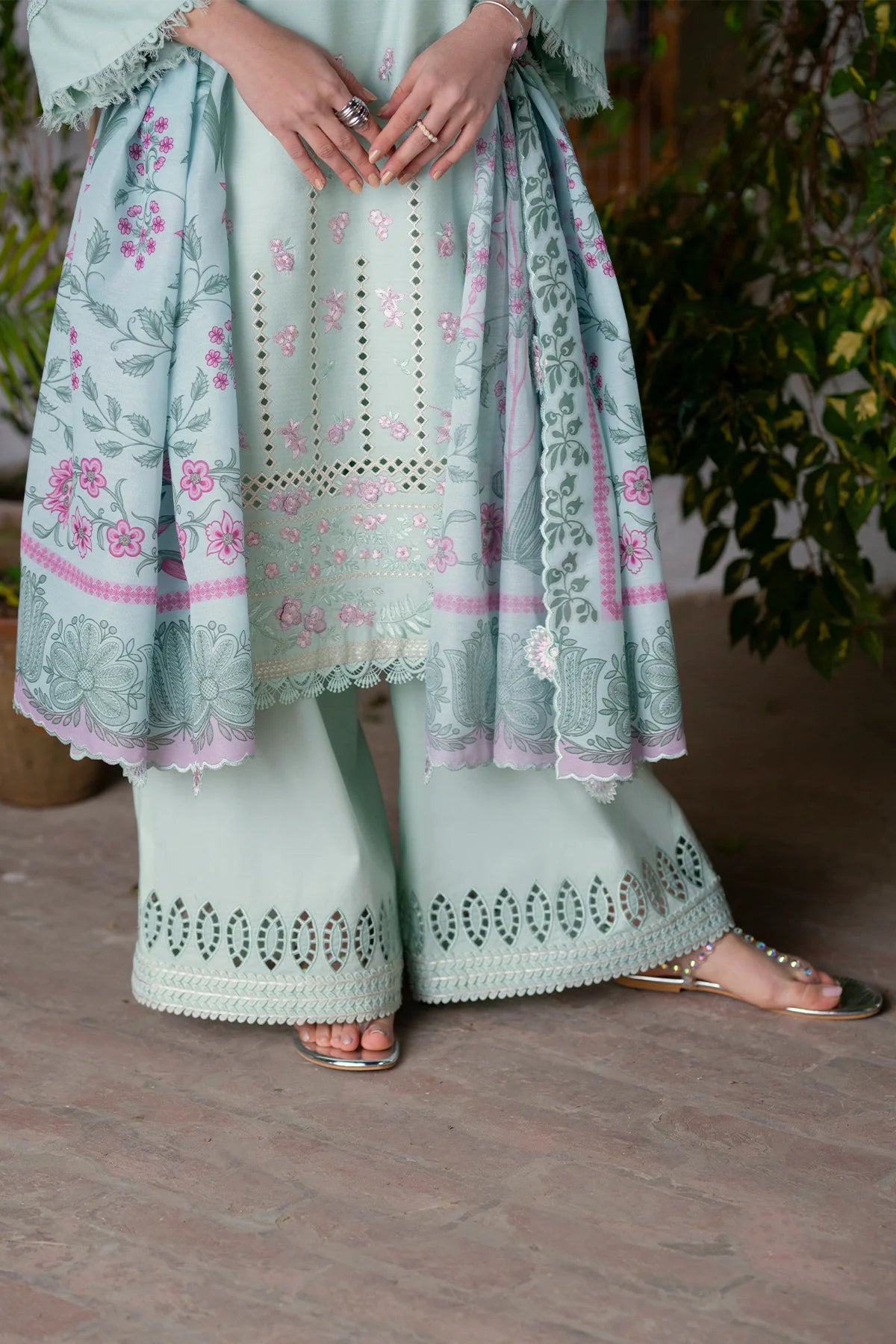 A dreamy pastel peach kurta adorned with delicate embroidery and intricate cutwork lace on the sleeves. Paired with a soft green dupatta featuring dainty floral embroidery and lace edging, this ensemble beautifully blends sophistication with a feminine charm.