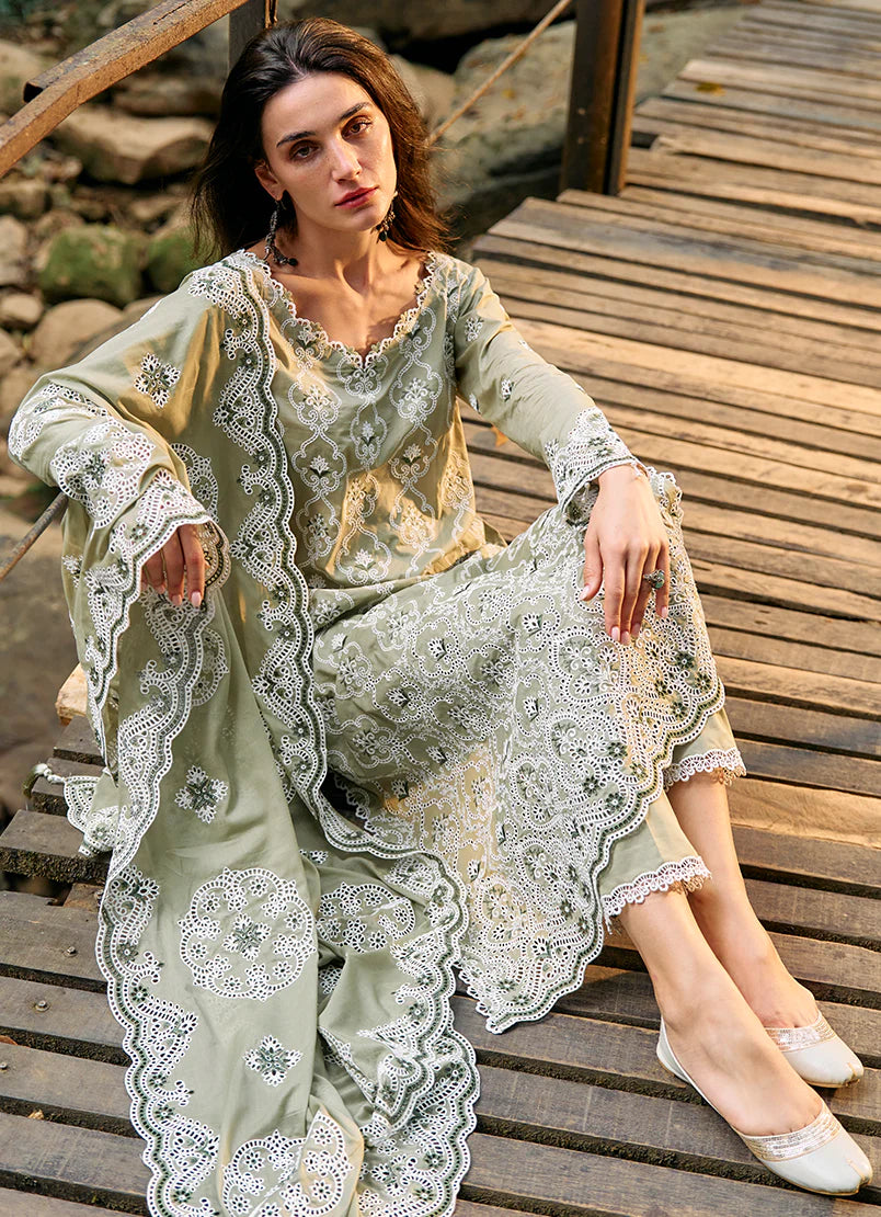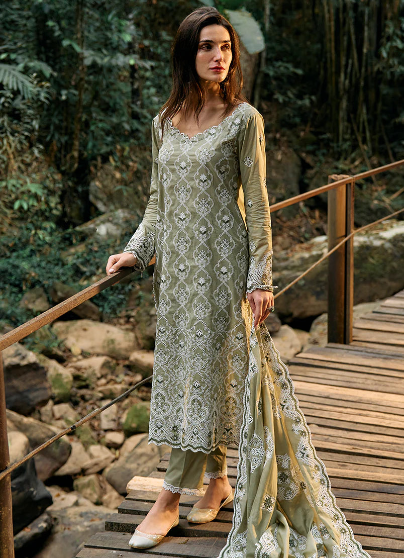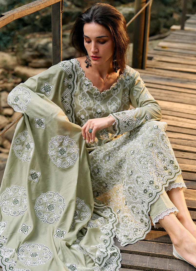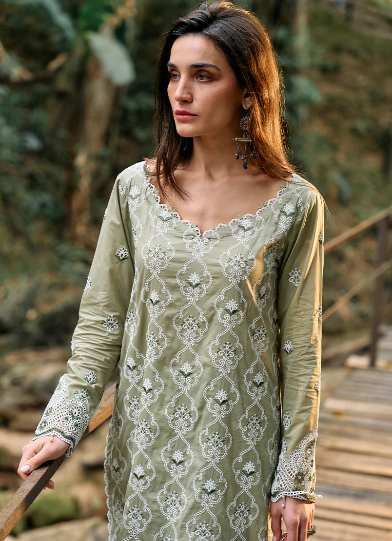 Nissa, stunningly intricate Schiffli embroidery on olive green base fabric on shirt and dupatta.
