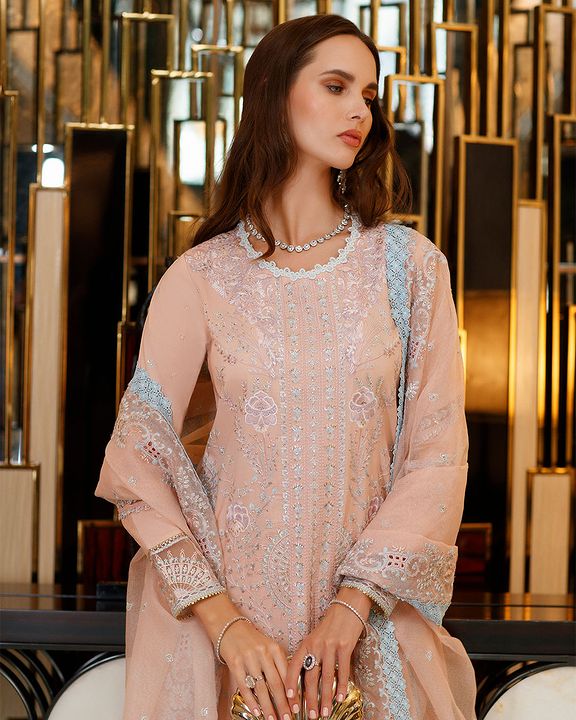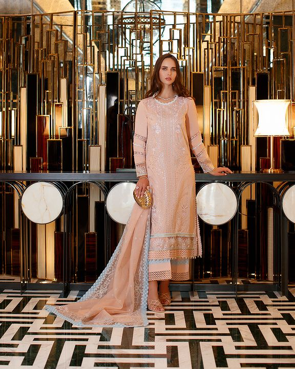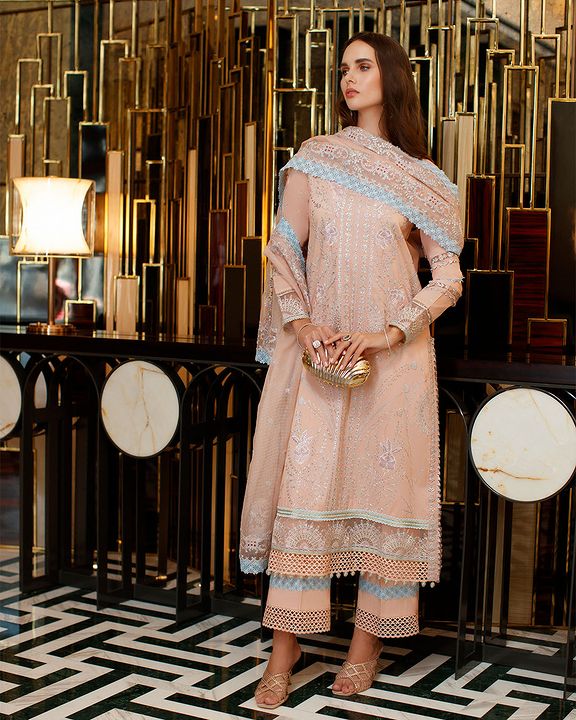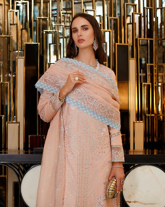 Radiate grace and poise with our peach ensemble, “Noor”, featuring delicate silver and white embellishments that lend an air of sophistication. Look effortlessly chic in this enchanting outfit that’s perfect for any occasion.