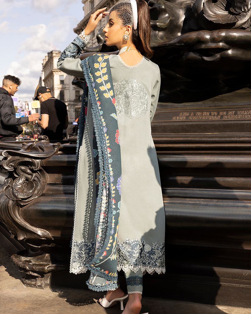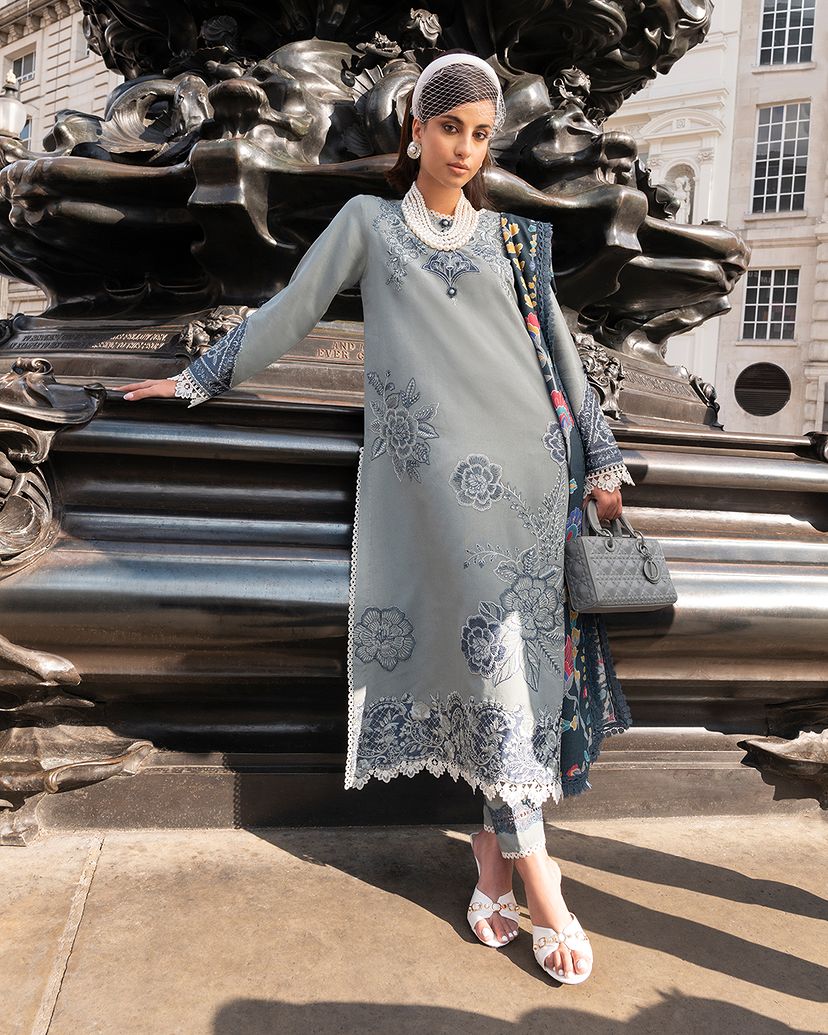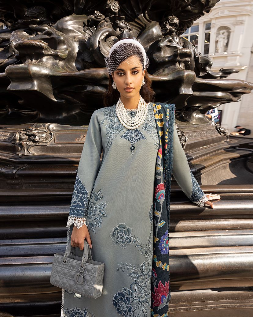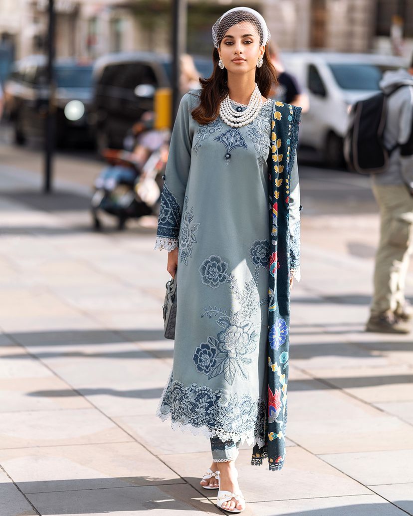 "Notting Hill", features embroidered karandi shirt, adorned with intricate detailing, captures the essence of timeless elegance. Paired with a printed khaddar shawl featuring delicate crochet lace finishing’s, this ensemble is a celebration of grace and charm, promising a look that resonates with poetic beauty.