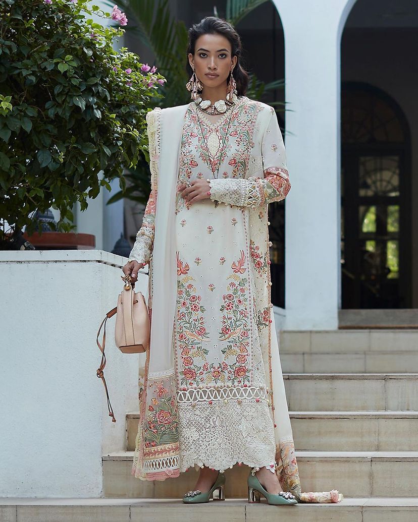 A plush cream canvas, ‘Nysa’ is layered with meticulously delicate stitches in soft hues of peach, Laguna, moss, sage and ivory to form an exquisite display of floral embroidery. Accentuated with intricate schiffli laid out in tessellated patterns, it comes paired with a diaphanous organza dupatta framed with an embroidered floral border and elaborate pallus flanked with an exquisite garden affair. This elegant design is a stylish statement that’ll be cherished by all.