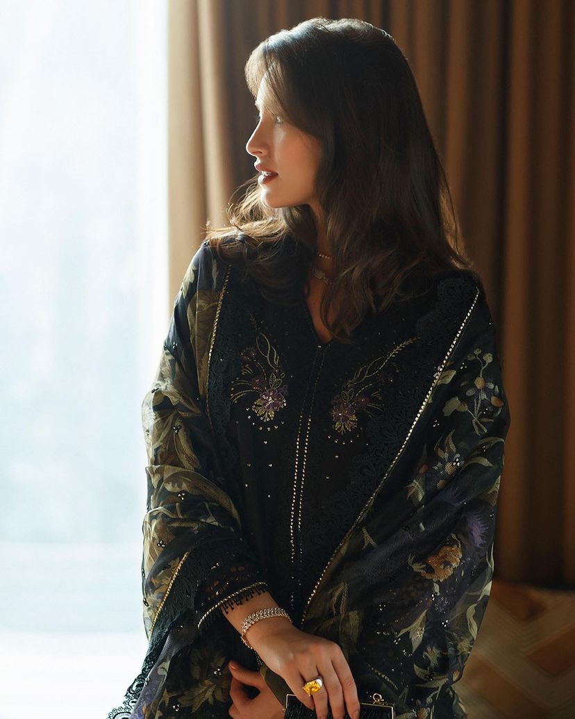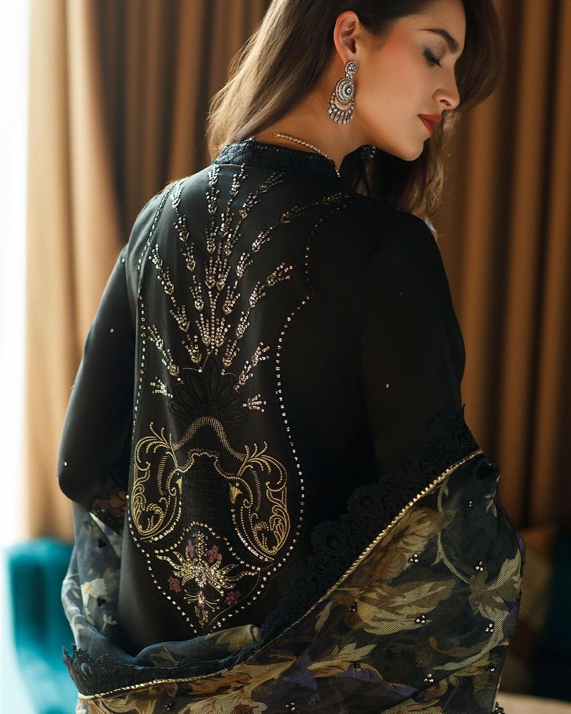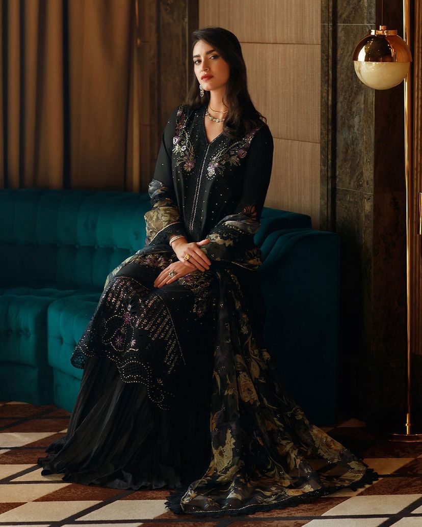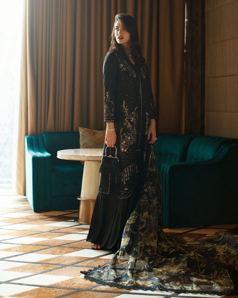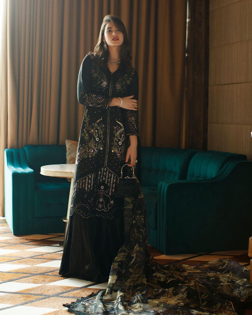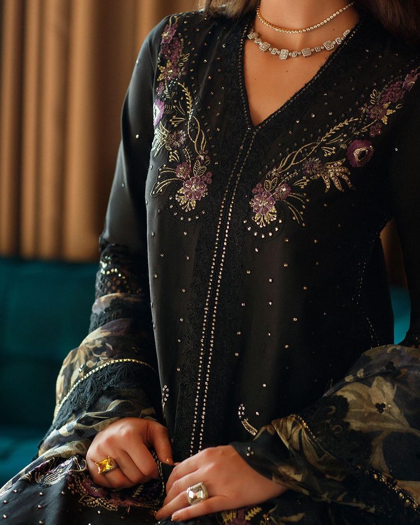 Step into the world of enchantment with our black ensemble, featuring mustard green floral embroidery that adds a touch of whimsy and charm to the outfit. The little embellishments bring a subtle touch of glamour to this captivating ensemble.