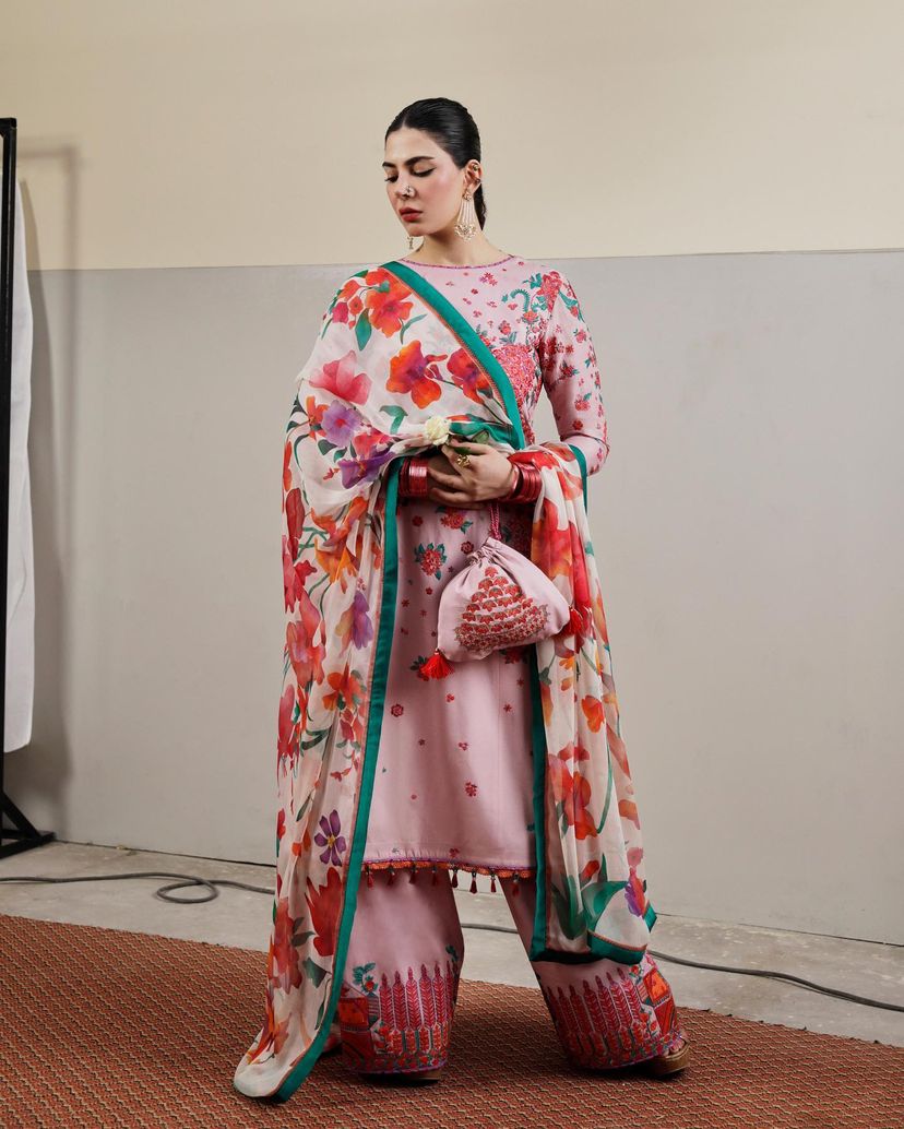 In a ravishing shade of purple, "Paeonia," is a sight to behold. Adorned with intricate multicolored floral embroidery patterns, it exudes an air of enticement. The embroidered lawn shirt, with its regal hue, comes alive with vibrant blossoms that seem to dance on the fabric. Paired with embroidered palazzo pants, it boasts a perfect balance of artistry and comfort. As you wrap the printed dupatta around you, a riot of colors bursts forth, merging cohesively with the floral motifs captivating all who set eyes upon it.