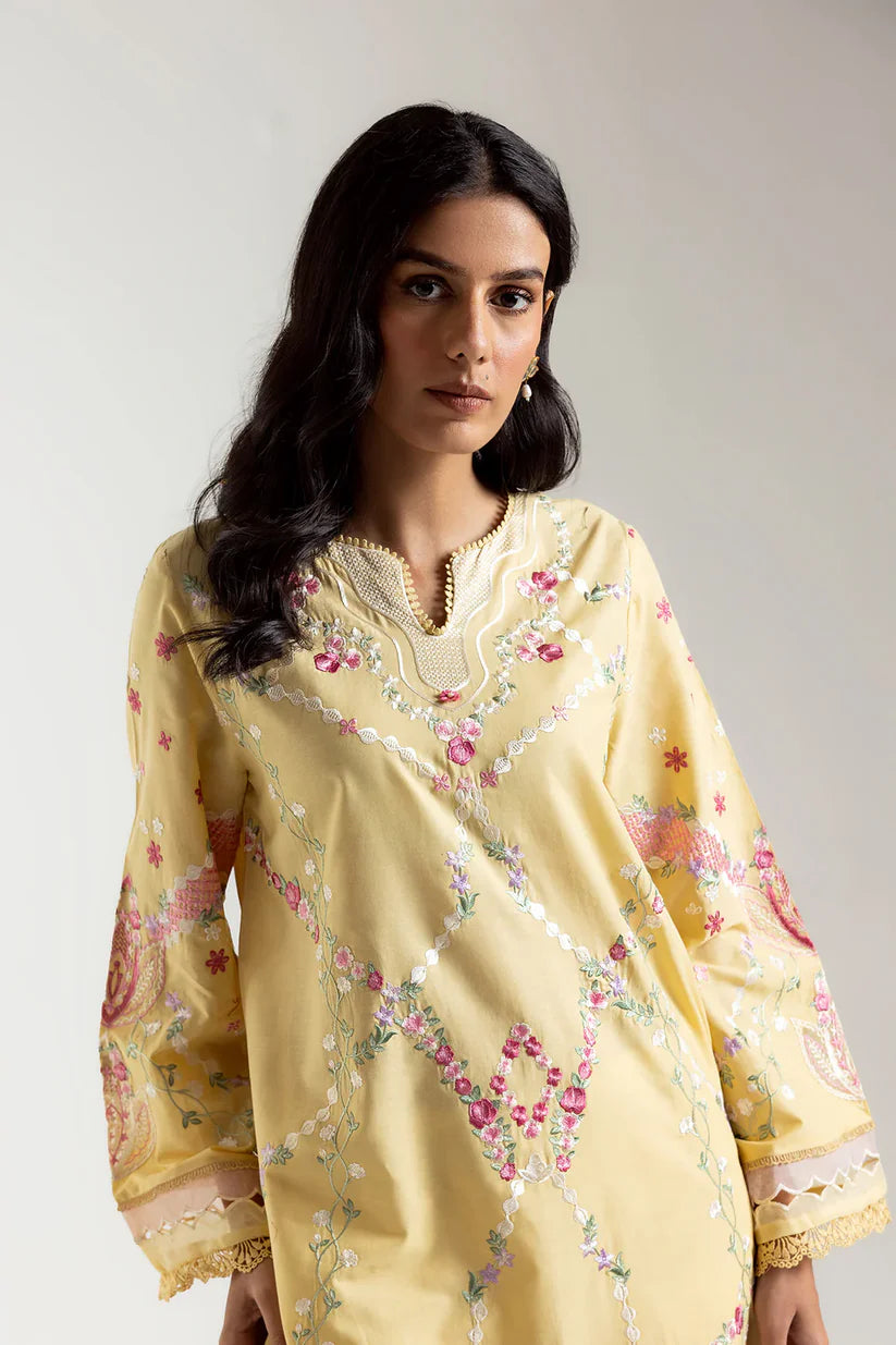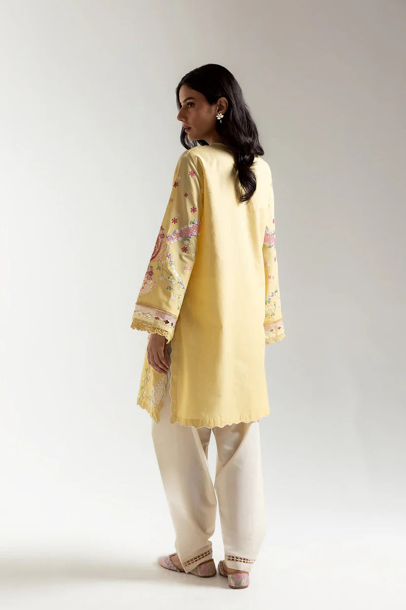 Embrace a touch of sunshine with this charming two-piece outfit, a delightful blend of traditional charm and contemporary style. The kurta, bathed in a soft yellow hue, showcases delicate floral embroidery in shades of pink and green, creating a visually enchanting tapestry. The subtly detailed round neckline and long sleeves contribute to the graceful silhouette. Completing the ensemble is a white shalwar, resulting in a sophisticated and culturally inspired look, perfect for adding a touch of refined artistry to one's wardrobe