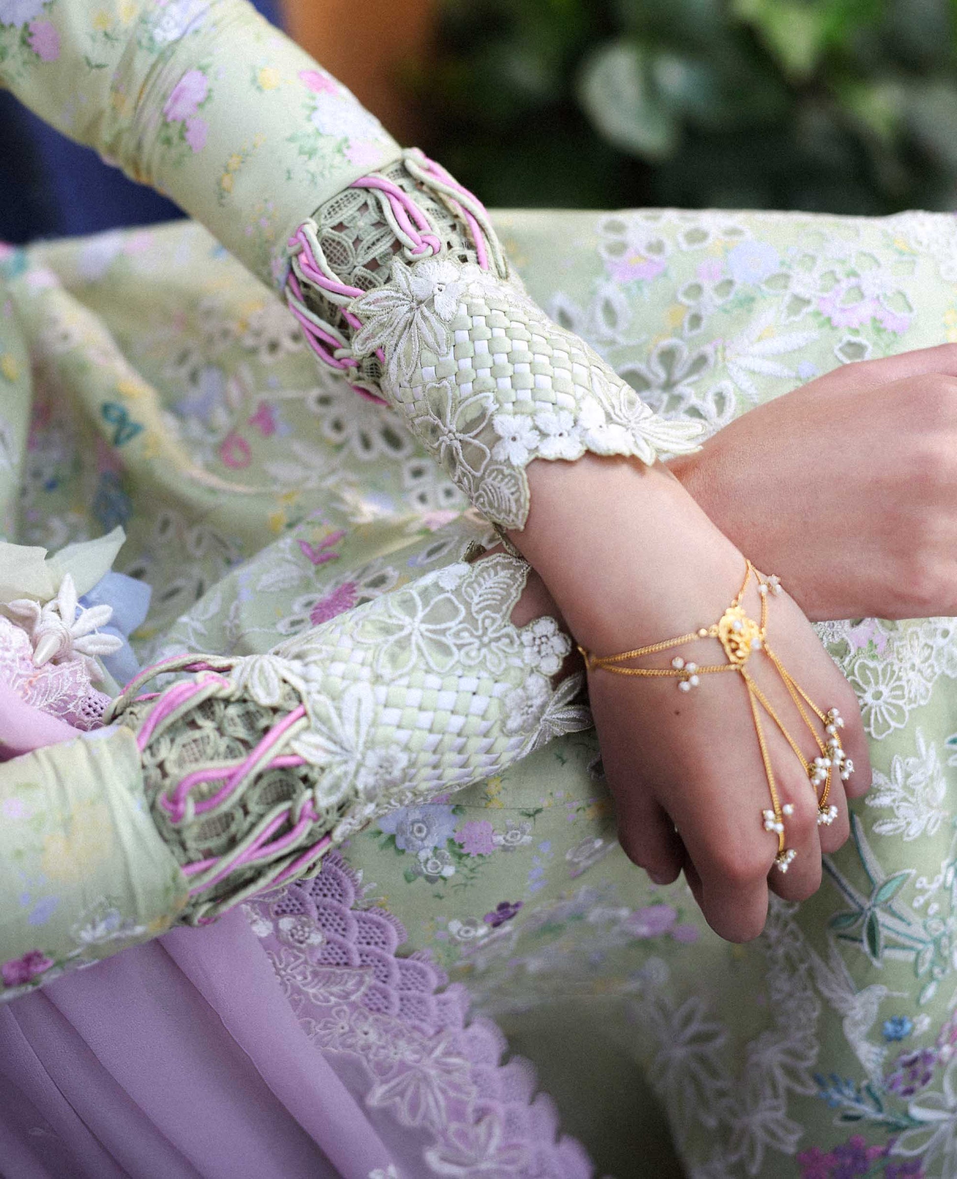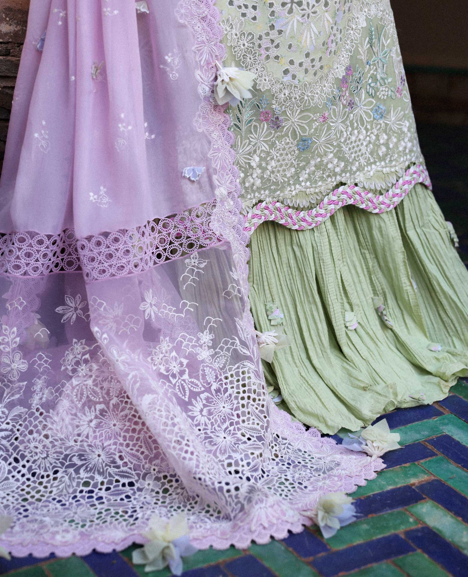 This three-panel apple green shirt combines floral prints with intricate embroidery, featuring a central laser-cut and boring panel in harmonious shades of pink, green, and blue, lightly accented with cream. The hem is thoughtfully bordered with subtle shikargah and botanical motifs, tying the design together gracefully. Sleeves are adorned with delicate floral sprays and finished with an organza border, paired with a flowing lilac chiffon dupatta featuring a contrast organza pallu with intricate boring technique. Completed with cambric trousers, this ensemble is airy, elegant, and perfect for Eid celebrations.
