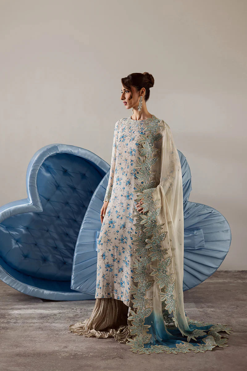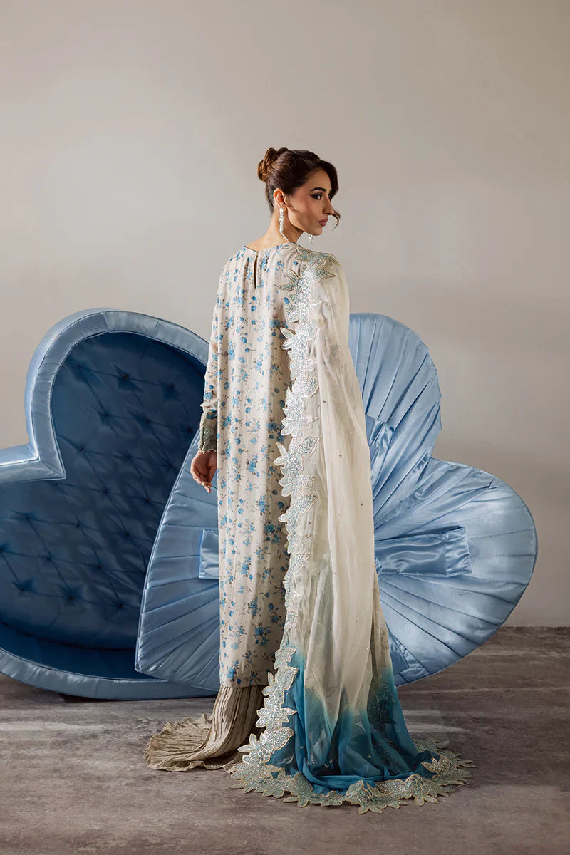 A beautifully designed chiffon long shirt, featuring a blend of embroidery and delicate prints, paired with a crushed raw silk trouser for an elegant finish. The look is completed with a two-tone chiffon dupatta, adorned with scalloped embroidered borders.