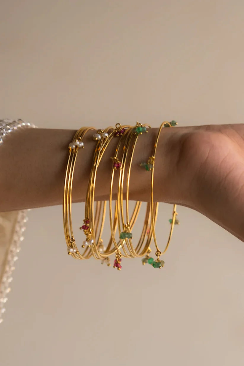This exquisite bangle set includes 12 pieces—6 sleek plain bangles and 6 adorned with real pearls and a stunning combination of emerald, aqua, and rhodonite stones.A perfect blend of classic elegance and vibrant hues for every occasion.