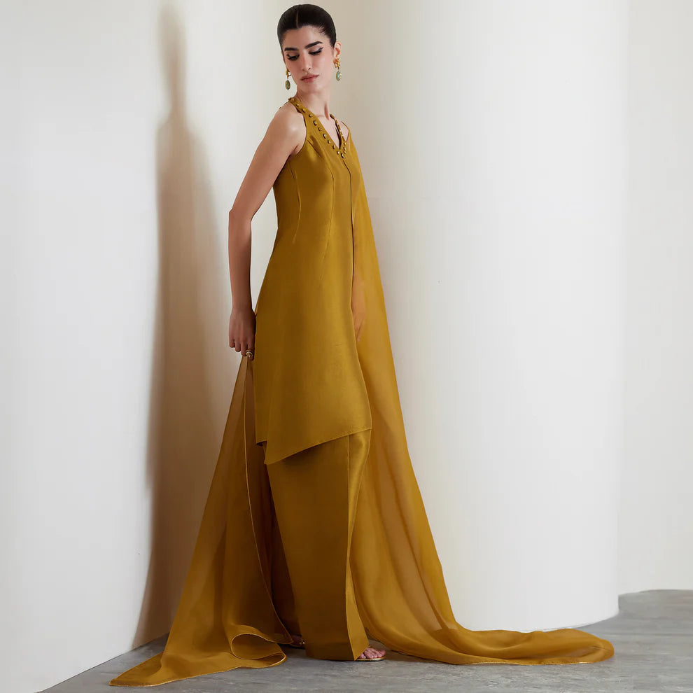 This mustard ensemble exudes refined elegance with its V-neckline adorned in subtle embellishments. A precisely placed dart along the front center adds structure and shape to the design. The flowing farshi shalwar brings a traditional flair, while the soft organza dupatta completes the look with minimal elegance.