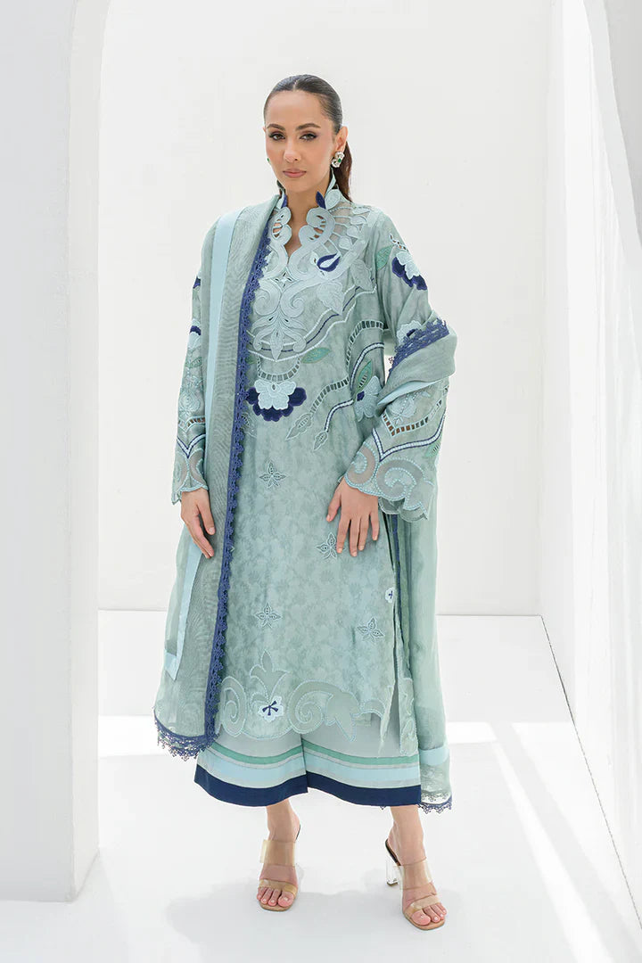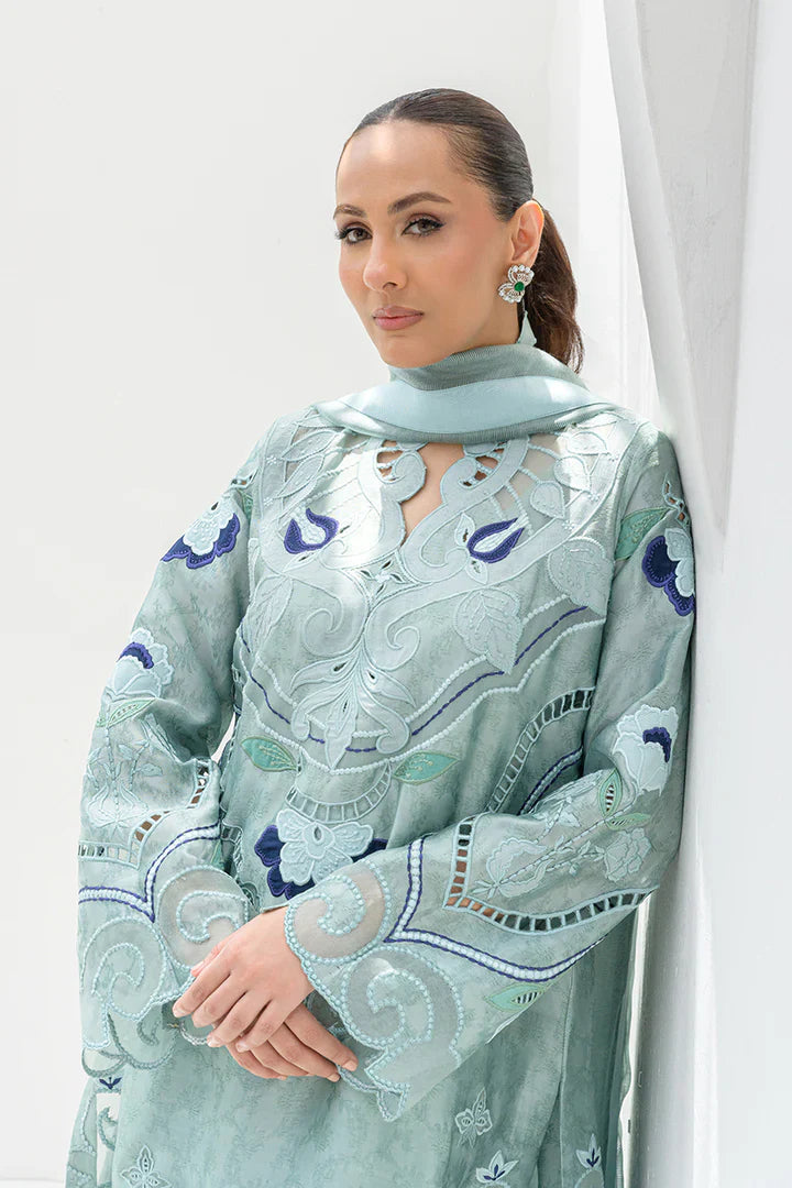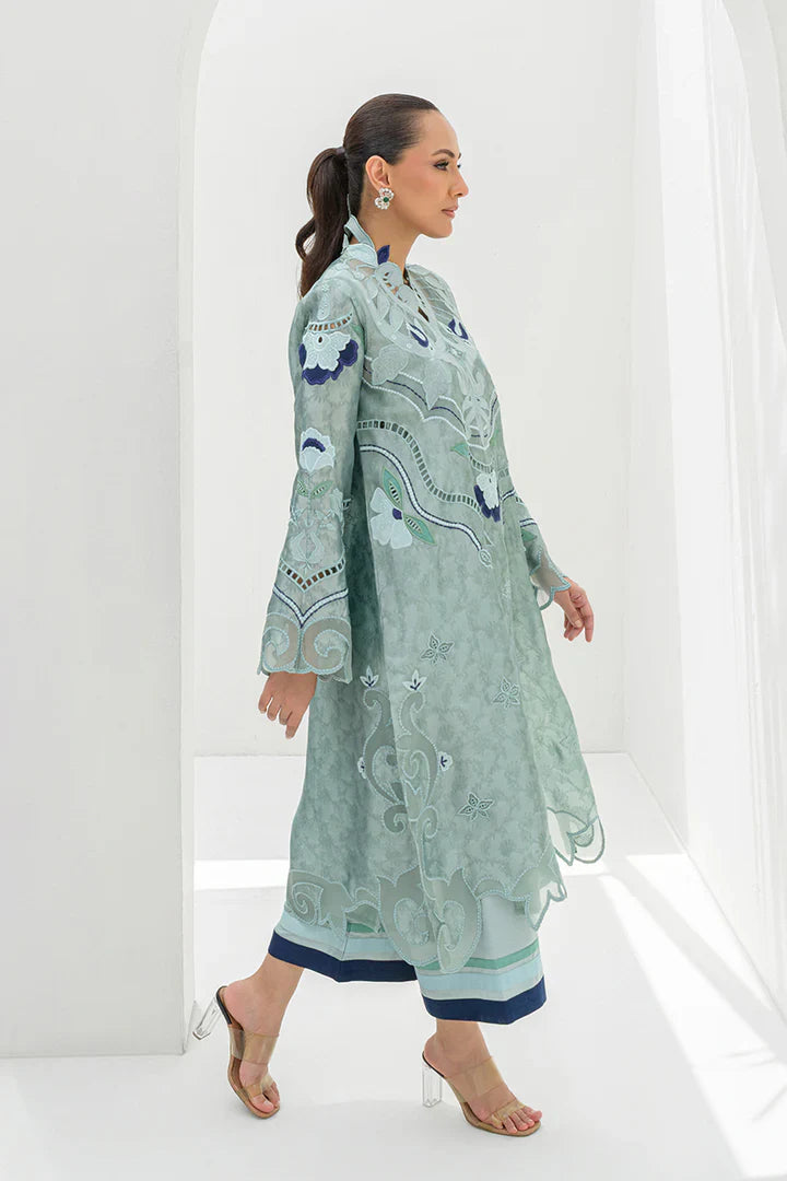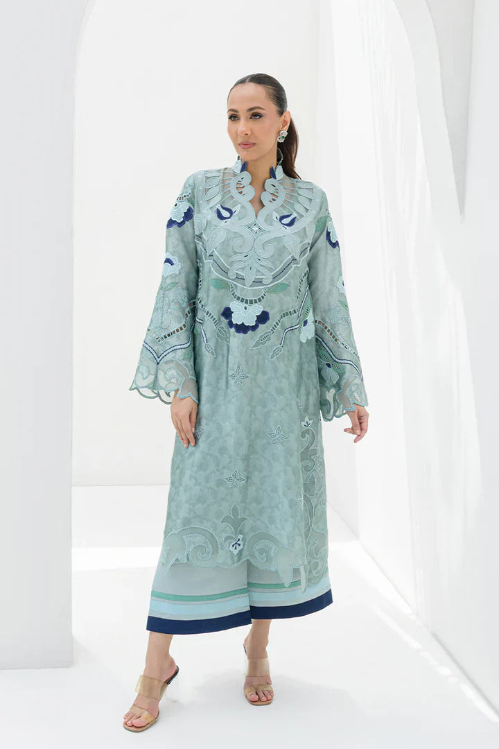 The trend setting outfit of the season in a turquoise colorway and a longer silhouette! A sheesha silk canvas beautifully crafted with applique and resham embroidery with a neckline that will make heads turn! The shirt is paired with culottes for an effortless and comfortable silhouette, tailored to perfection!