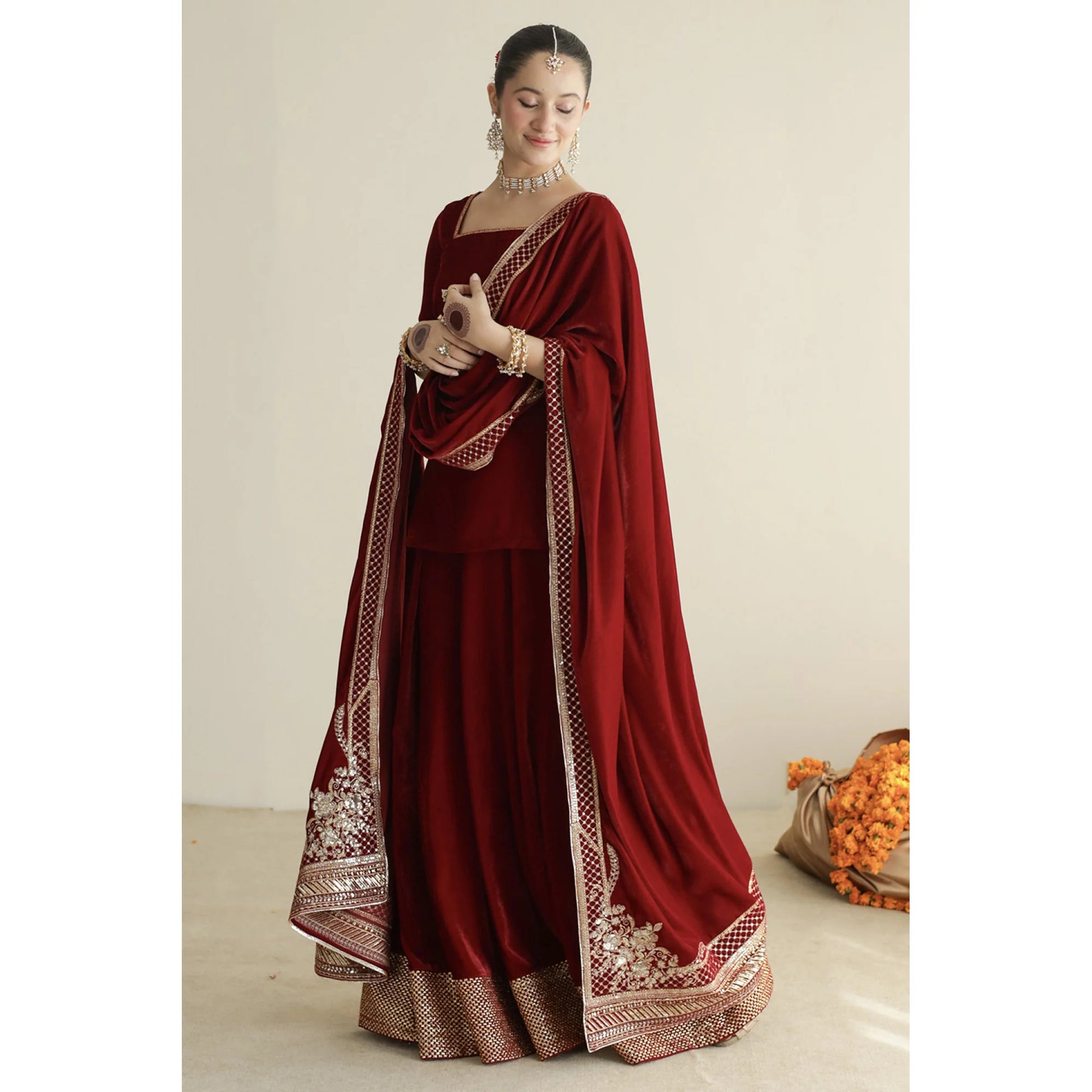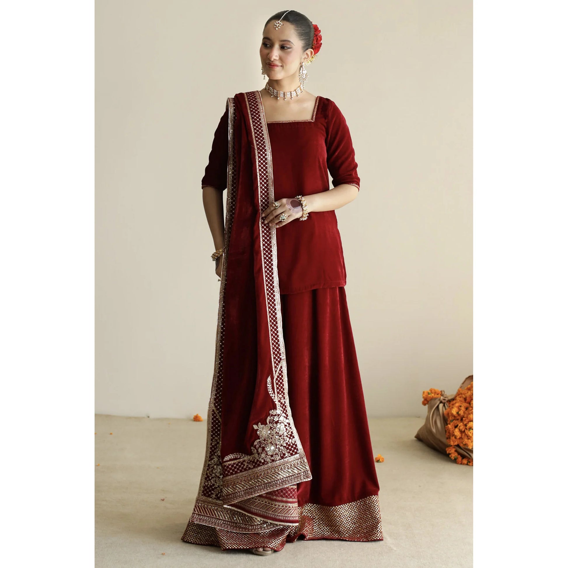 Red velvet long shirt with badla embroidery paired with a sharara and a velvet chaddar.