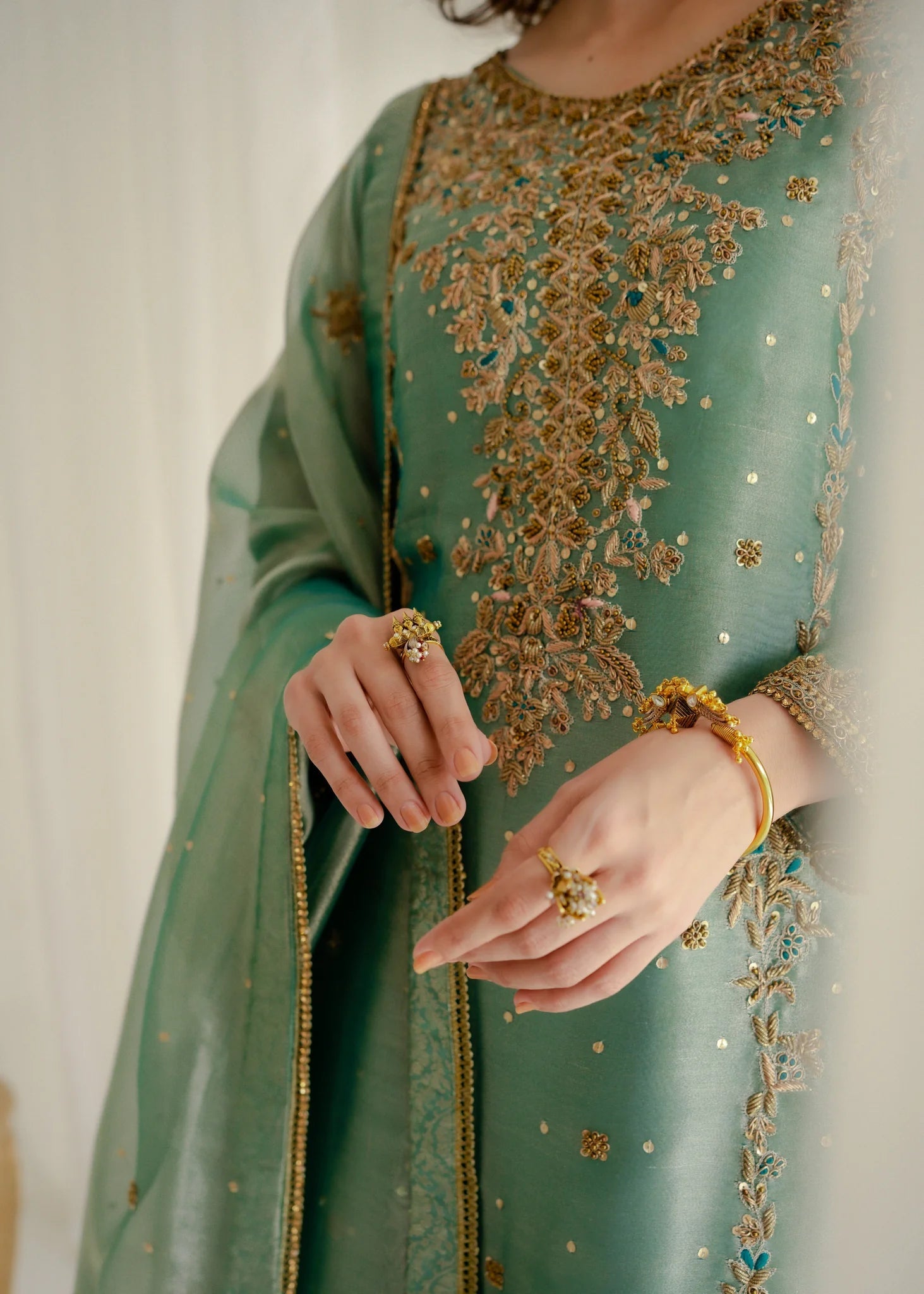 Reha embodies elegance wrapped in serene teal tones. This three-piece ensemble is tailored from pure tissue fabric with a fully lined shirt and trousers, ensuring structure and comfort. The hand embroidery in dull gold is beautifully balanced with subtle hints of baby pink and zinc silk threads along the neckline, hem, and panels. Paired with a matching tissue dupatta, bordered with jamawar facing for a touch of classic sophistication. Reha is a perfect pick for wedding guests who favour understated luxury and soft radiance.