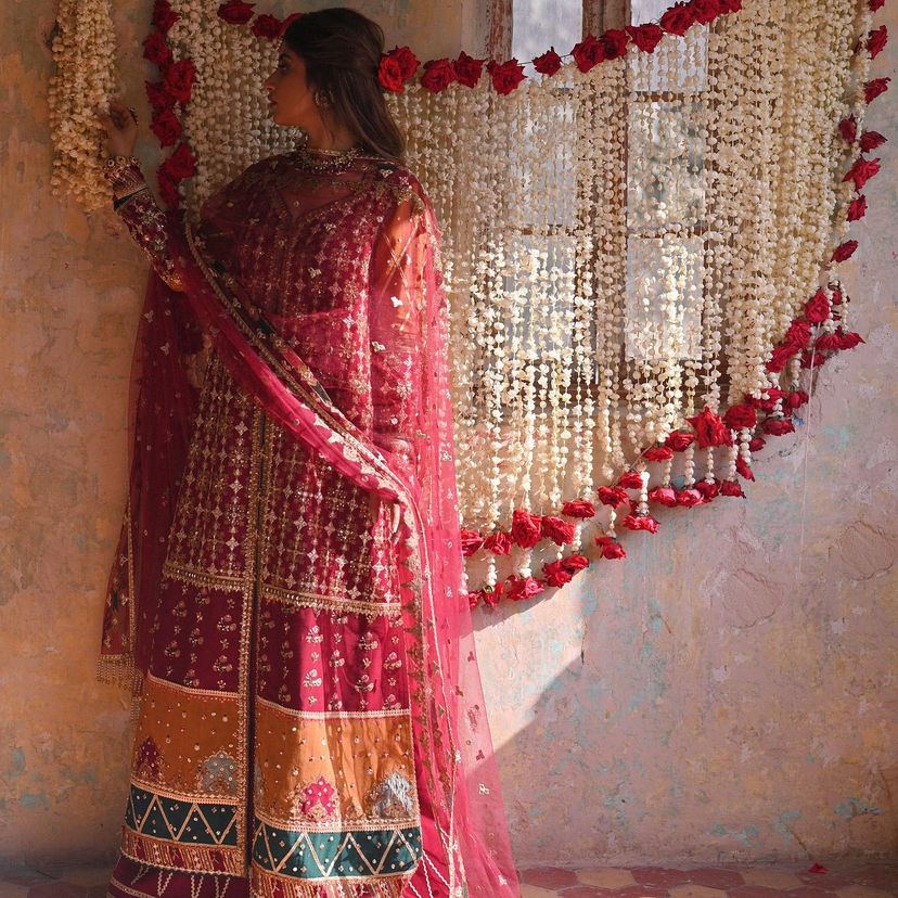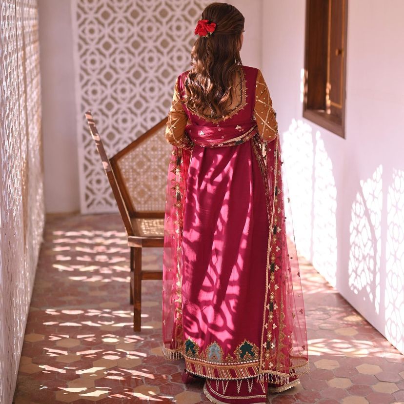 A vibrant masterpiece of color and craftsmanship, this ensemble dazzles with handmade embroidery, mirror work, and lace. Intricate patchwork, block printing, cut work, and tilla embroidery create a rich tapestry of texture. The elegant dupatta with tassels adds a touch of refinement. Paired with flowing raw silk trousers, it exudes a luxurious yet relaxed allure.