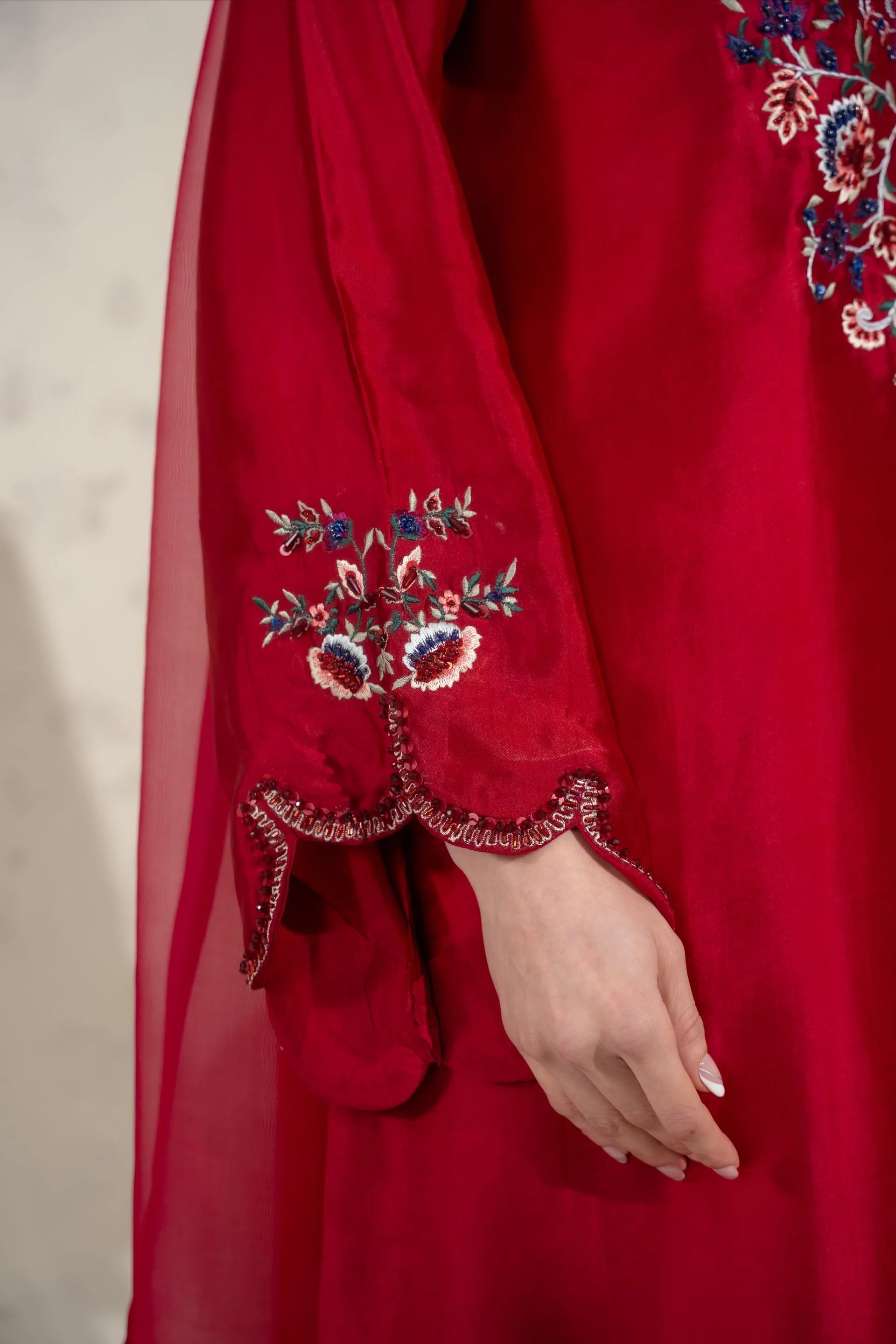 A heavy hand embellished rich colour 3pc set on pure sheesha Silk, embellished in monotones, it comes with a pure organza duppata and a straight trouser.