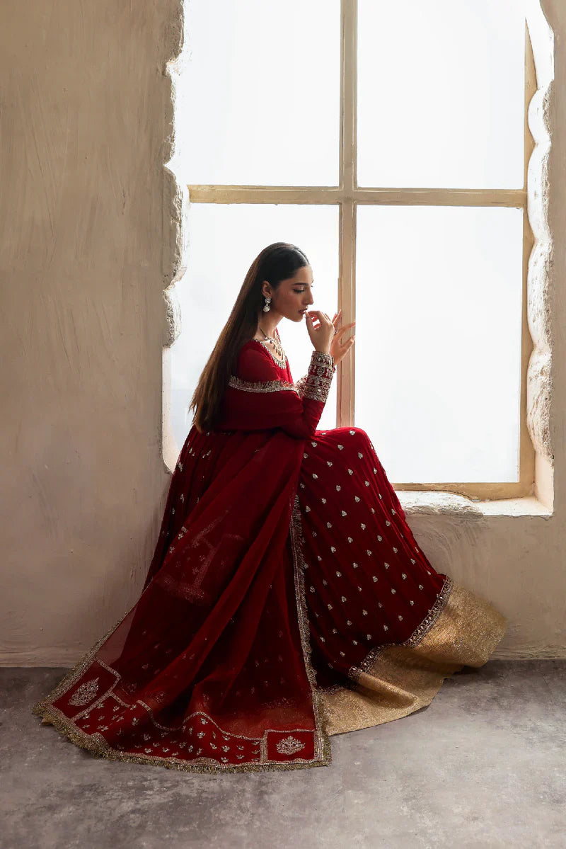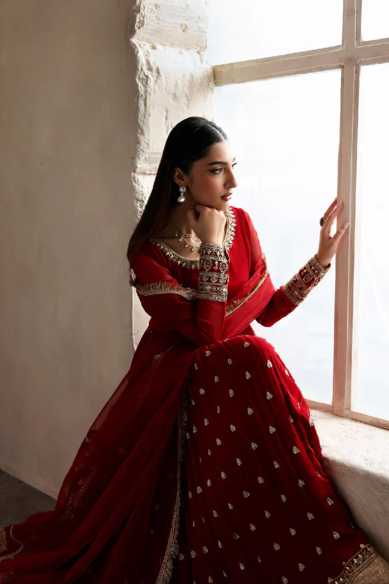 Rich red Anarkali adorned with delicate embroidery, sequins, and gold embellishments, paired with a sheer dupatta for an effortlessly regal look