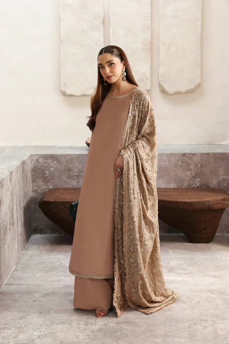 A luxe beige-gold embellished shawl styled with a raw silk long shirt adorned with intricate embroidered borders and tassels, paired gracefully with raw silk trousers