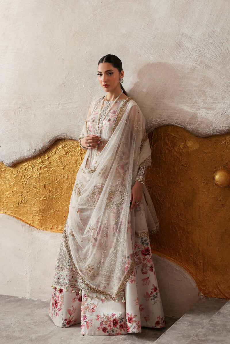 A graceful ivory floral hand embellished outfit with intricate silver and pastel embroidery, paired with a soft floral printed flared lehanga. Completed with a sheer embellished dupatta for an elegant finish.