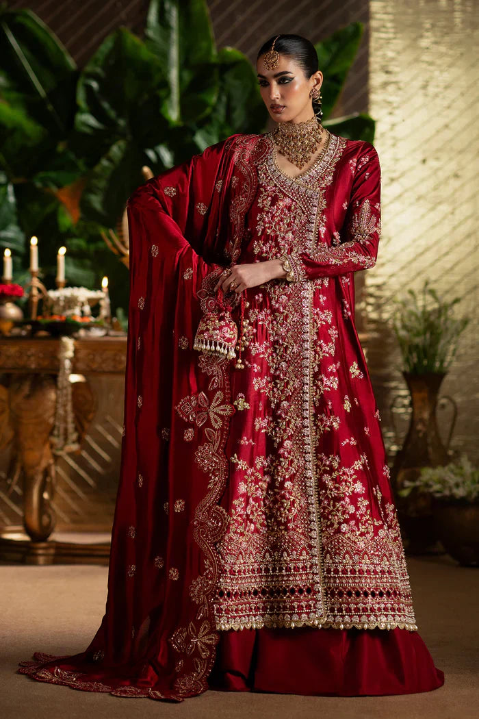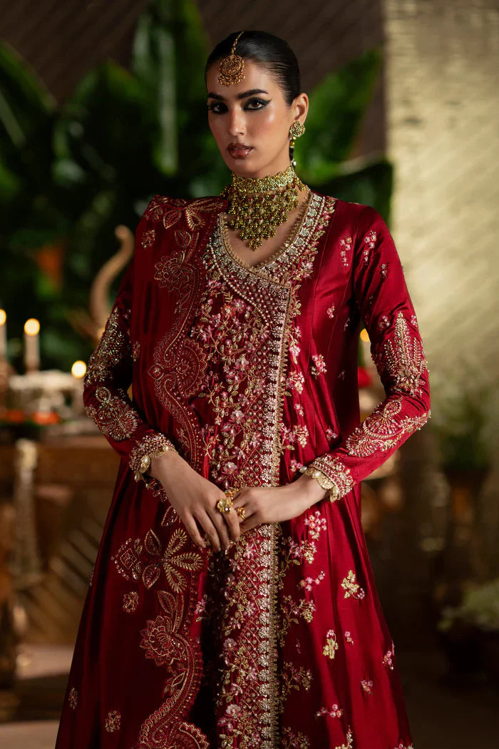 A timeless deep red angarkha adorned with exquisite miniature embroidery in vibrant hues, enriched with delicate handwork that speaks of true craftsmanship. Paired with a beautifully embroidered dupatta and classic sharara pants, this ensemble is a perfect blend of elegance and tradition.