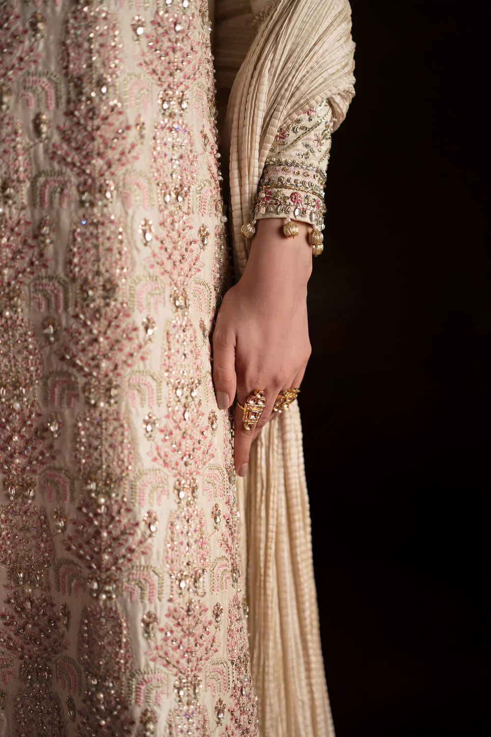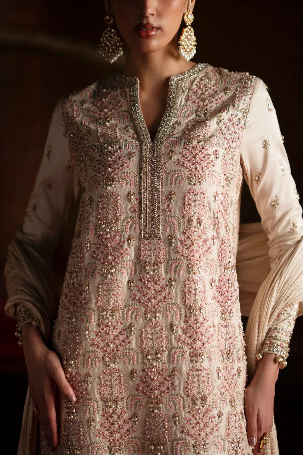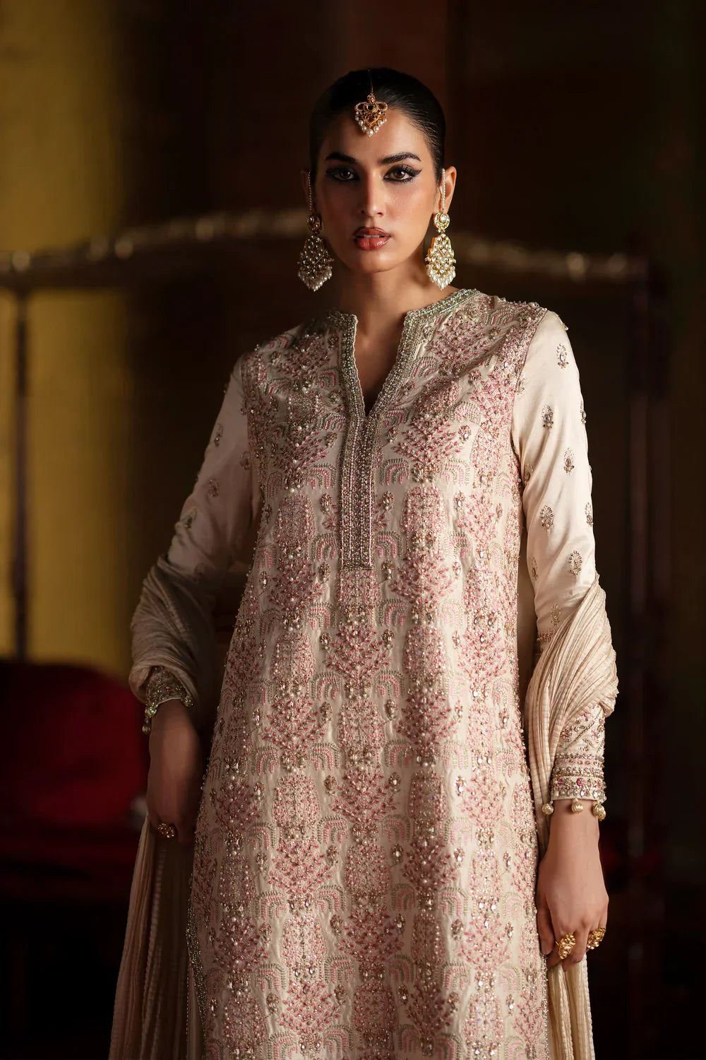 A timeless long shirt in rich raw silk, adorned with delicate pastel-toned embroidery and intricate handwork detailing. Paired with classic azaar pants and a beautifully textured crushed dupatta, this ensemble strikes the perfect balance of elegance and chic sophistication.